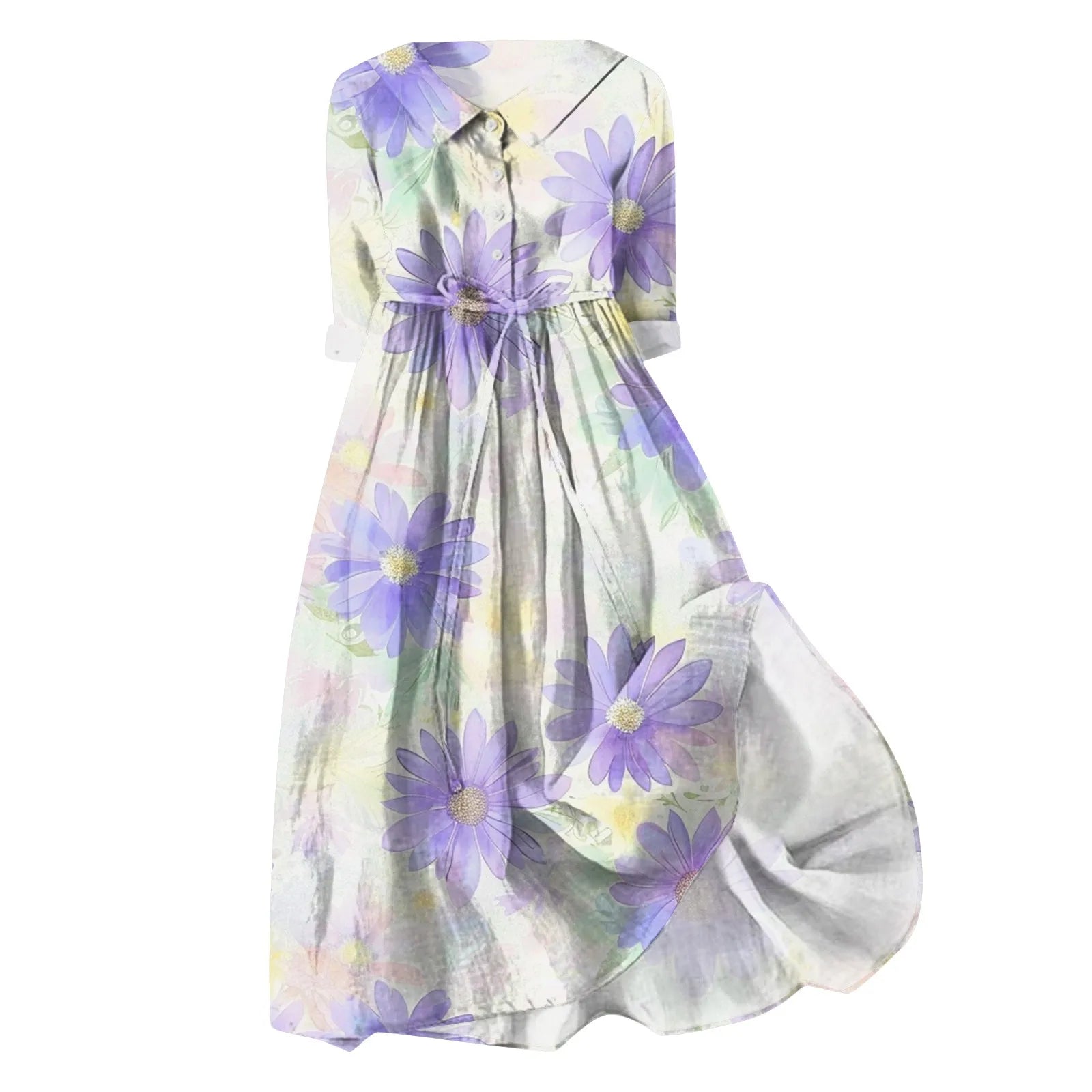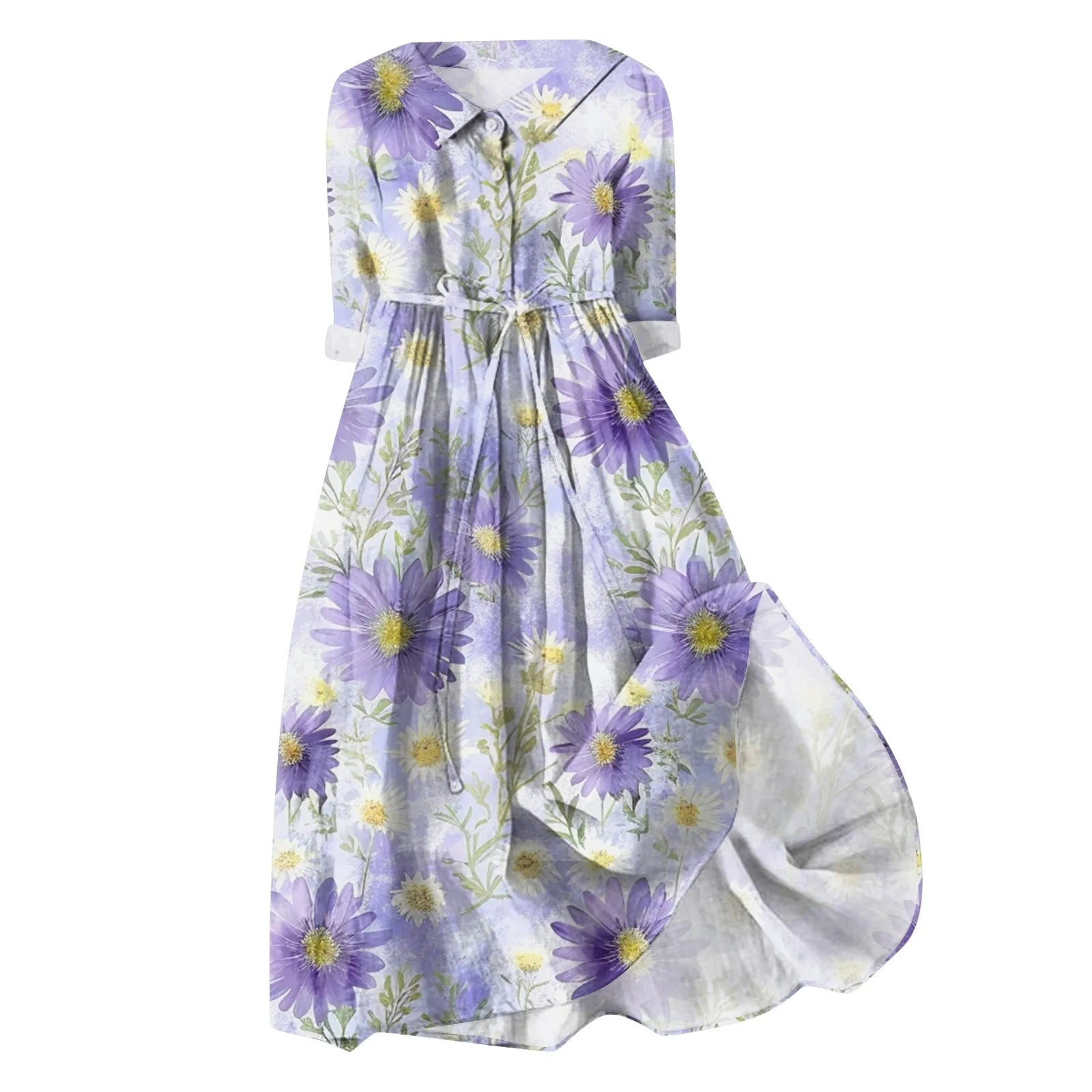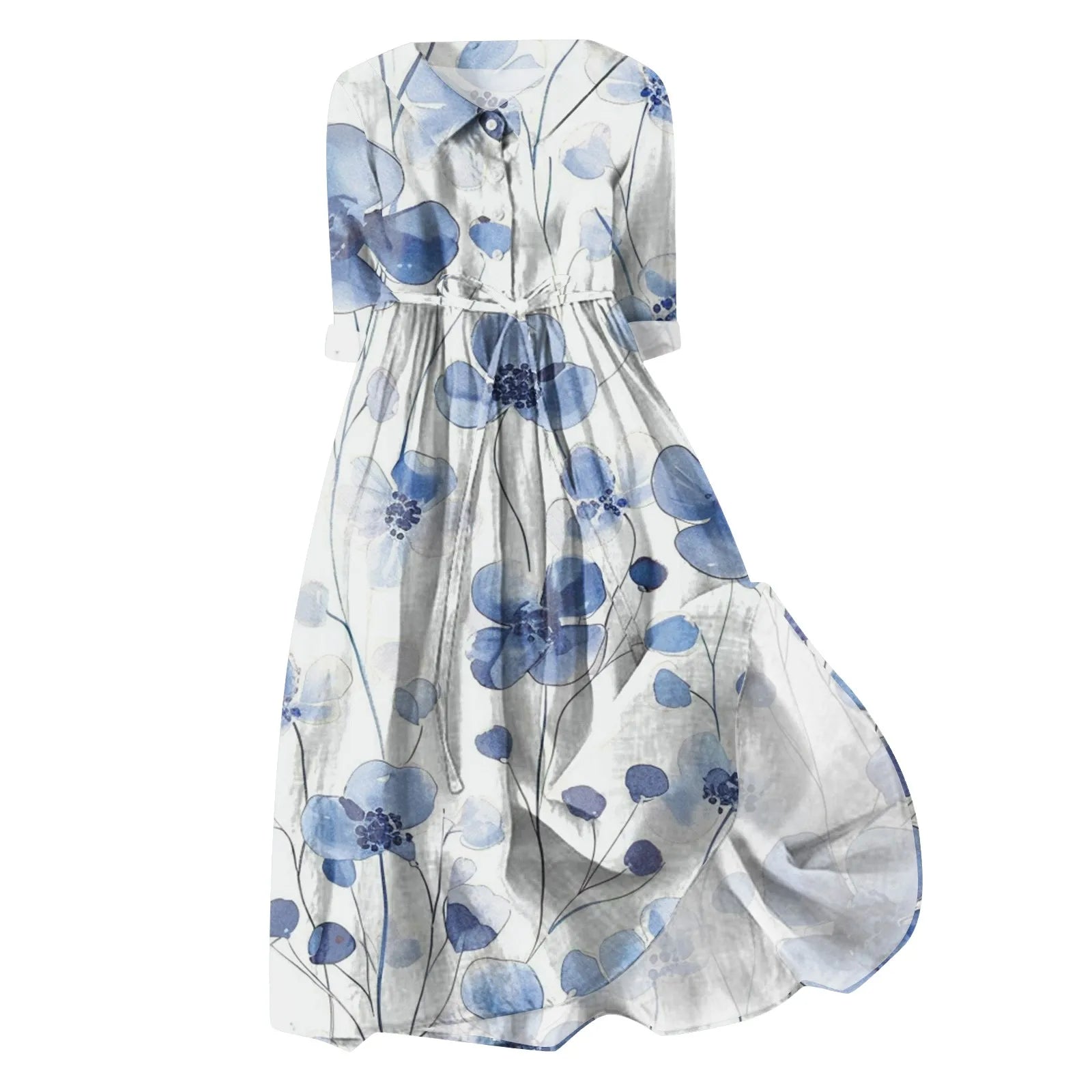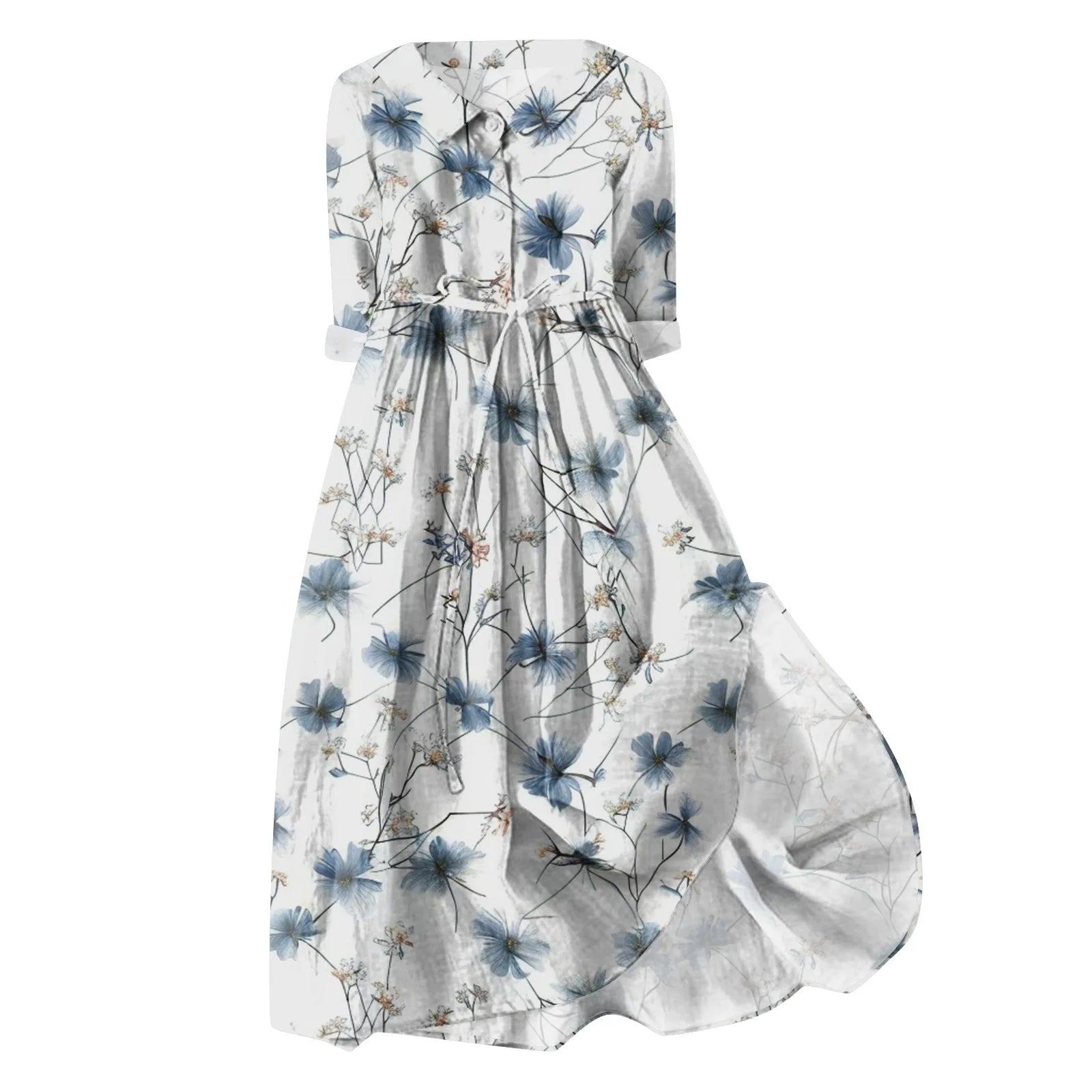Women Bohemian Summer Dress Long Sleeve Plain Floral A Line Dresses Maxi Button Up Dress With Belt