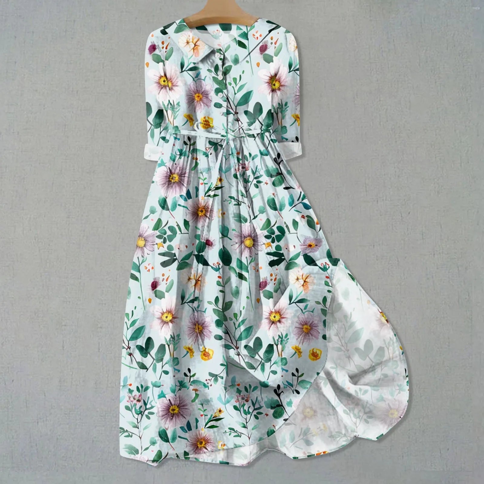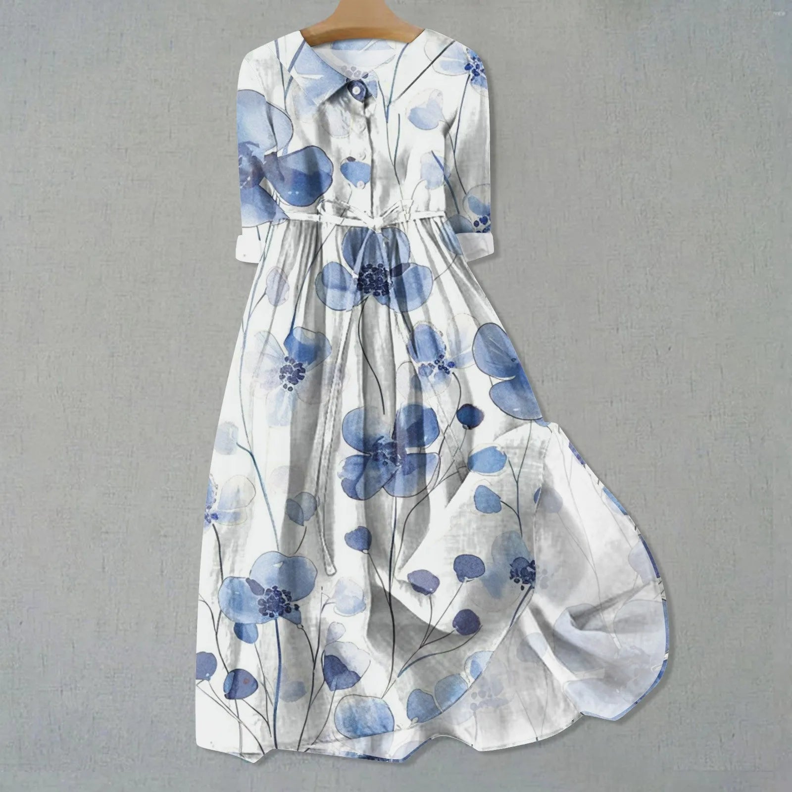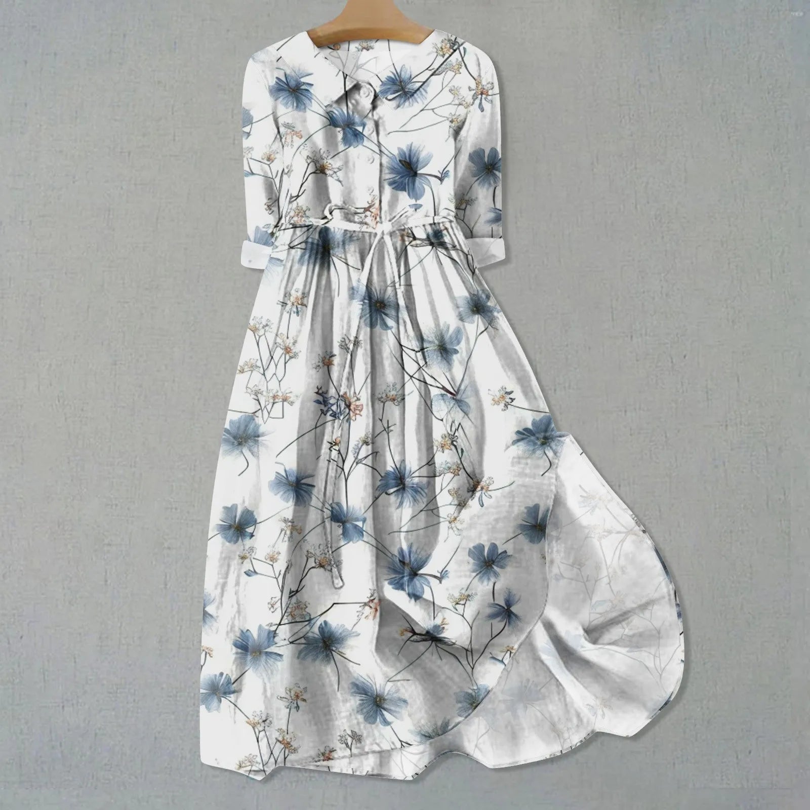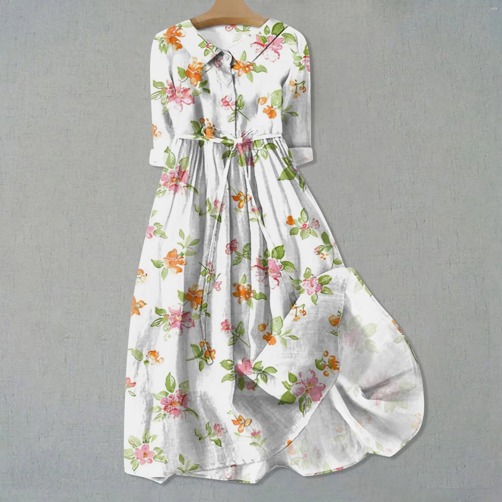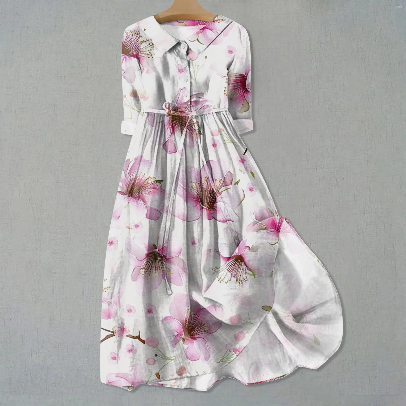 Women Bohemian Summer Dress Long Sleeve Plain Floral A Line Dresses Maxi Button Up Dress With Belt
