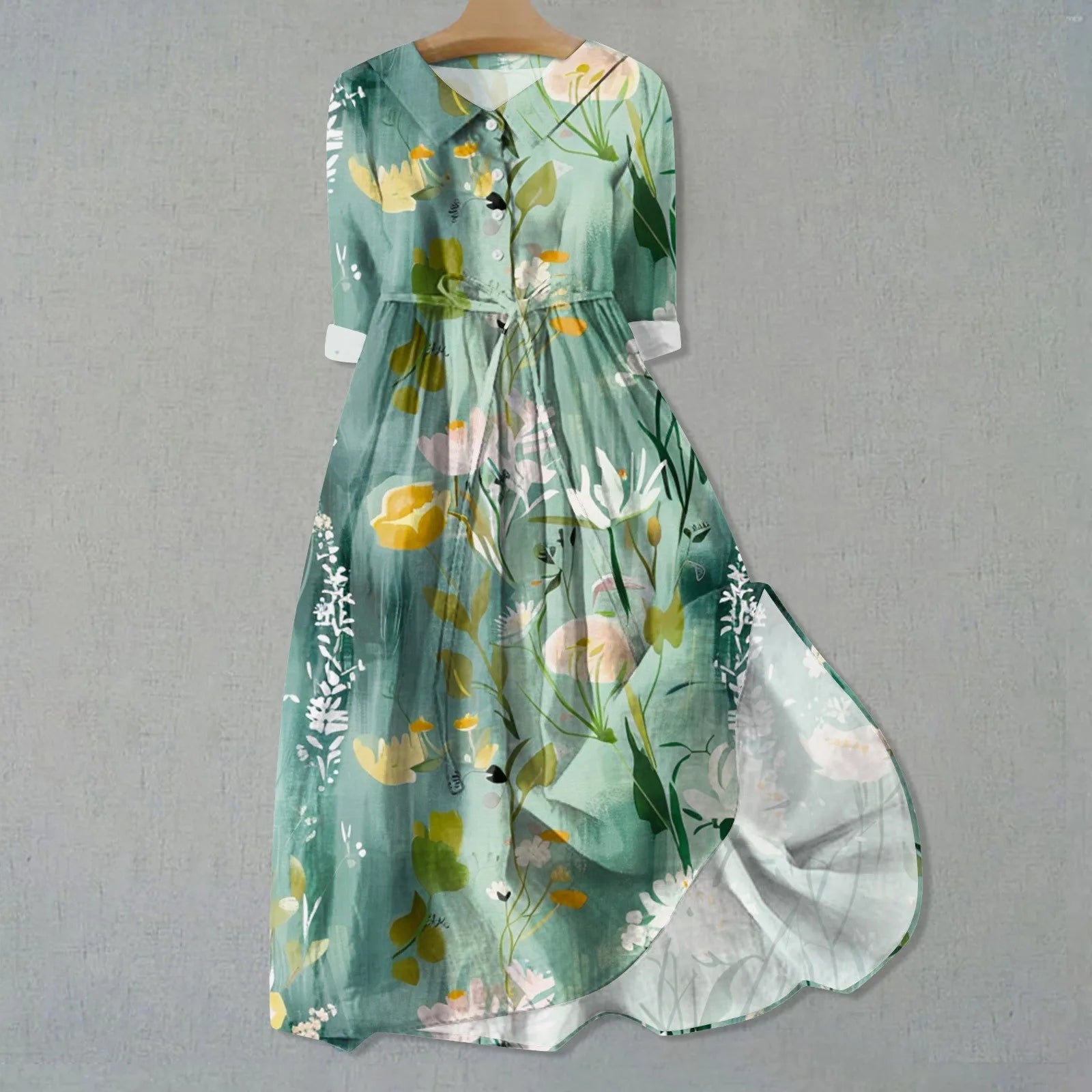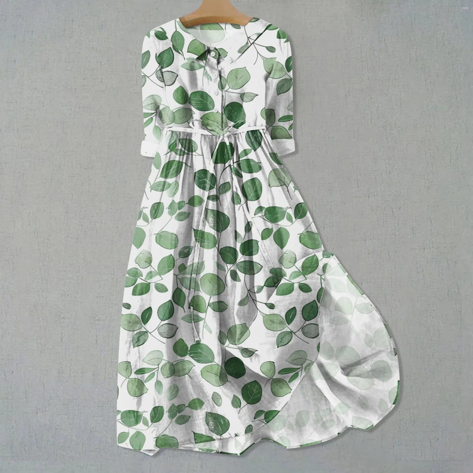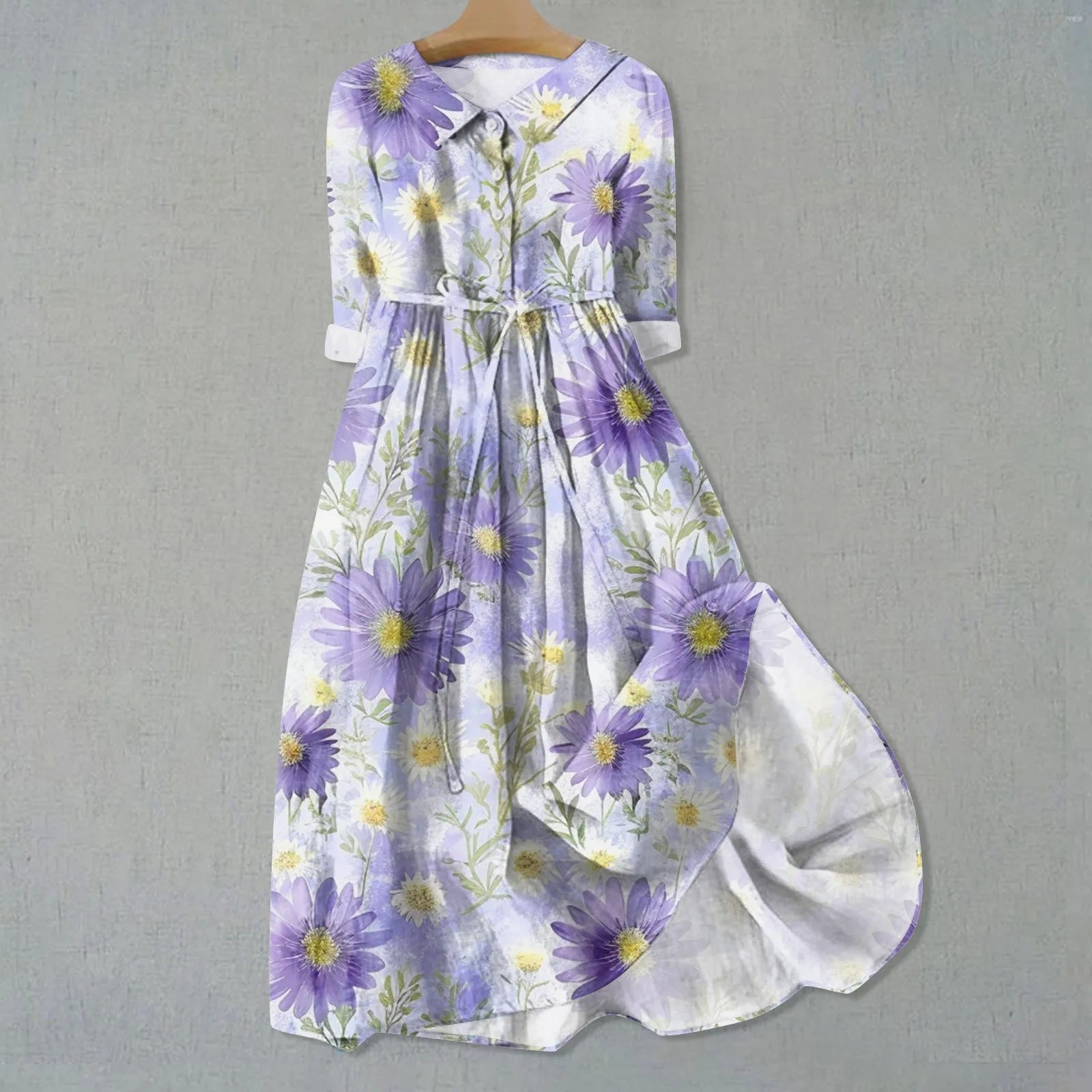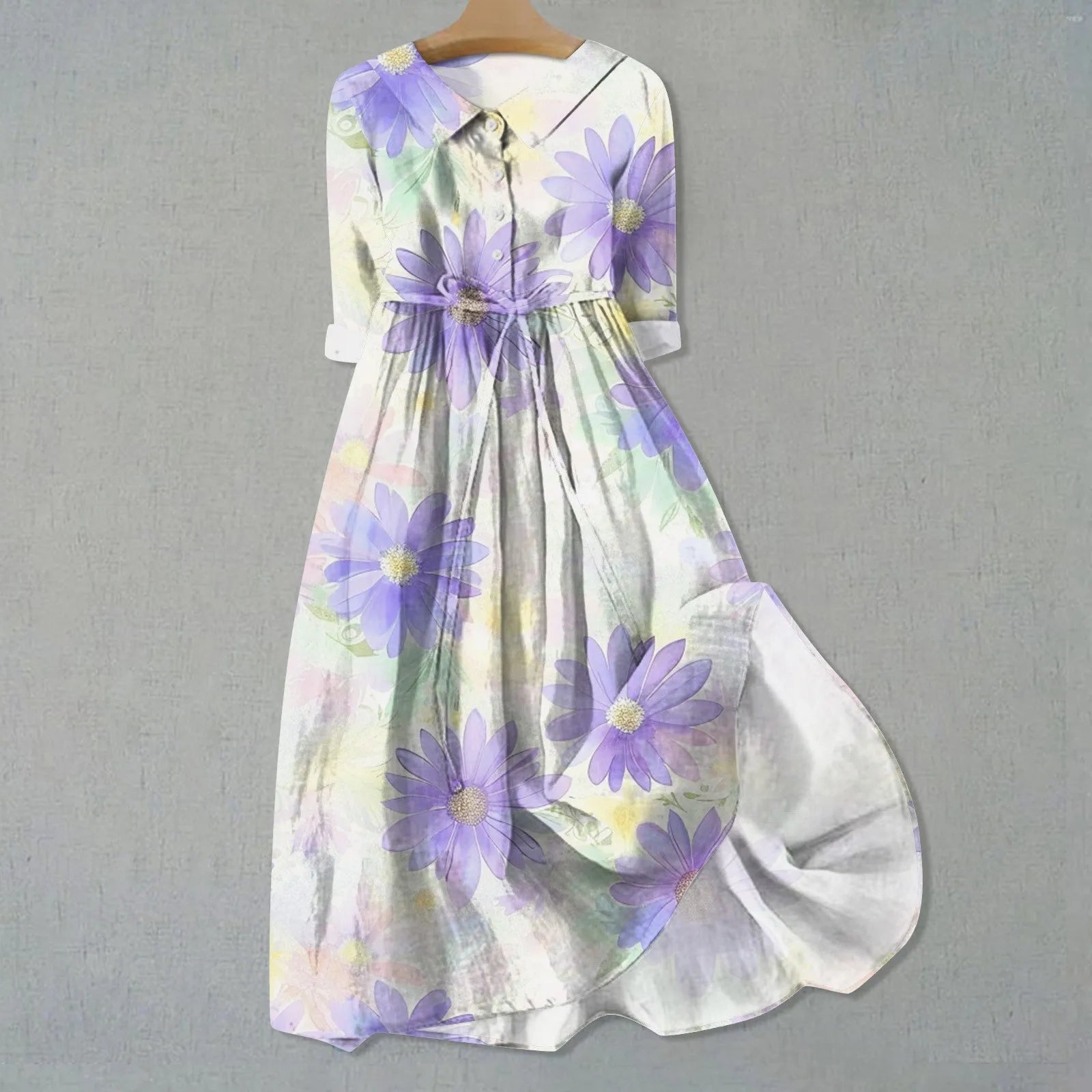 Women Bohemian Summer Dress Long Sleeve Plain Floral A Line Dresses Maxi Button Up Dress With Belt