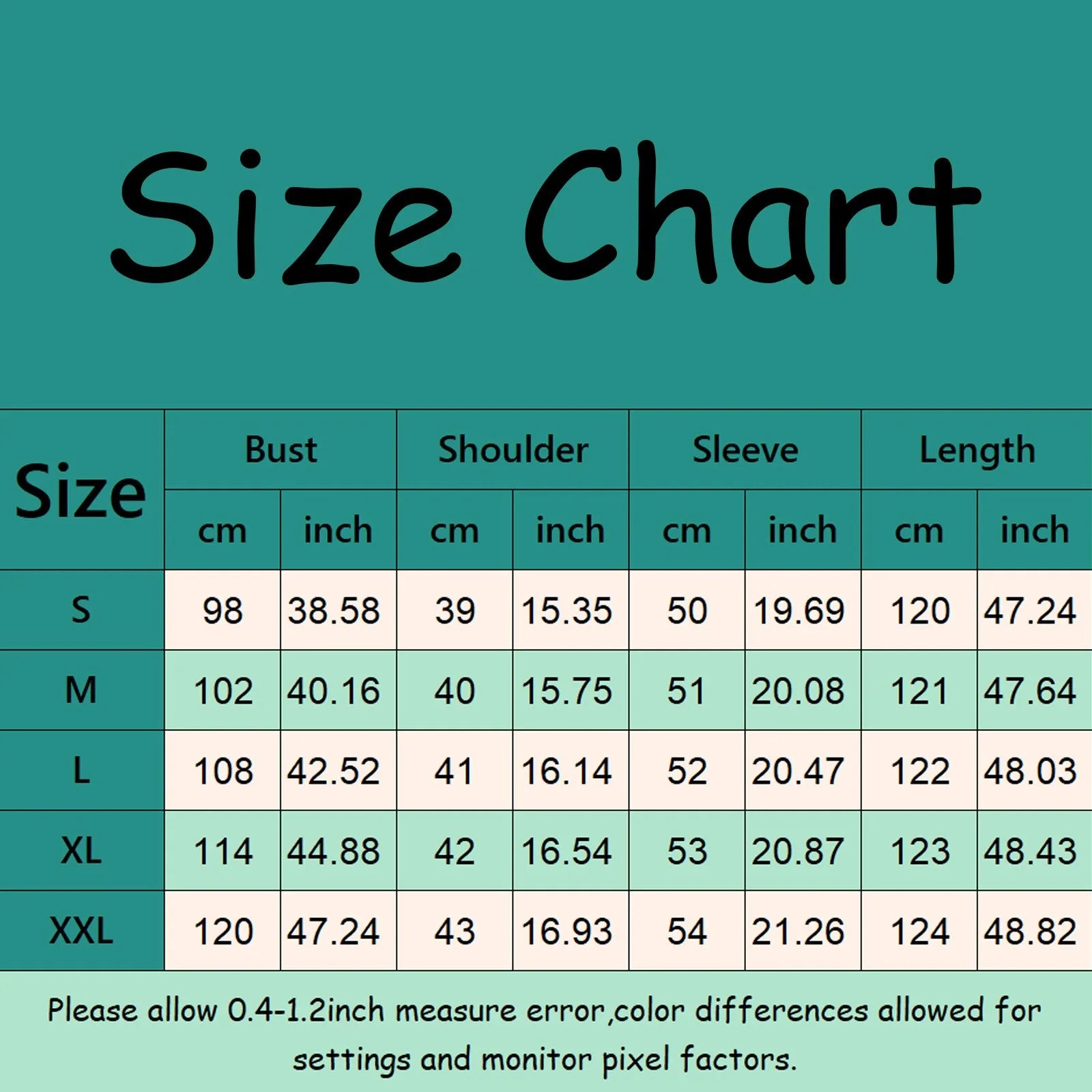 Size Bust Shoulder Sleeve Length S 98cm/38.58'' 39cm/15.35'' 50cm/19.69'' 120cm/47.24'' M 102cm/40.16'' 40cm/15.75'' 51cm/20.08'' 121cm/47.64'' L 108cm/42.52'' 41cm/16.14'' 52cm/20.47'' 122cm/48.03'' XL 114cm/44.88'' 42cm/16.54'' 53cm/20.87'' 123cm/48.43'' XXL 120cm/47.24'' 43cm/16.93'' 54cm/21.26'' 124cm/48.82'' Size:S Bust:98cm/38.58'' Shoulder:39cm/15.35'' Sleeve:50cm/19.69'' Length:120cm/47.24'' Size:M Bust:102cm/40.16'' Shoulder:40cm/15.75'' Sleeve:51cm/20.08'' Length:121cm/47.64'' Size:L Bust:108cm/42.52'' Shoulder:41cm/16.14'' Sleeve:52cm/20.47'' Length:122cm/48.03'' Size:XL Bust:114cm/44.88'' Shoulder:42cm/16.54'' Sleeve:53cm/20.87'' Length:123cm/48.43'' Size:XXL Bust:120cm/47.24'' Shoulder:43cm/16.93'' Sleeve:54cm/21.26'' Length:124cm/48.82''