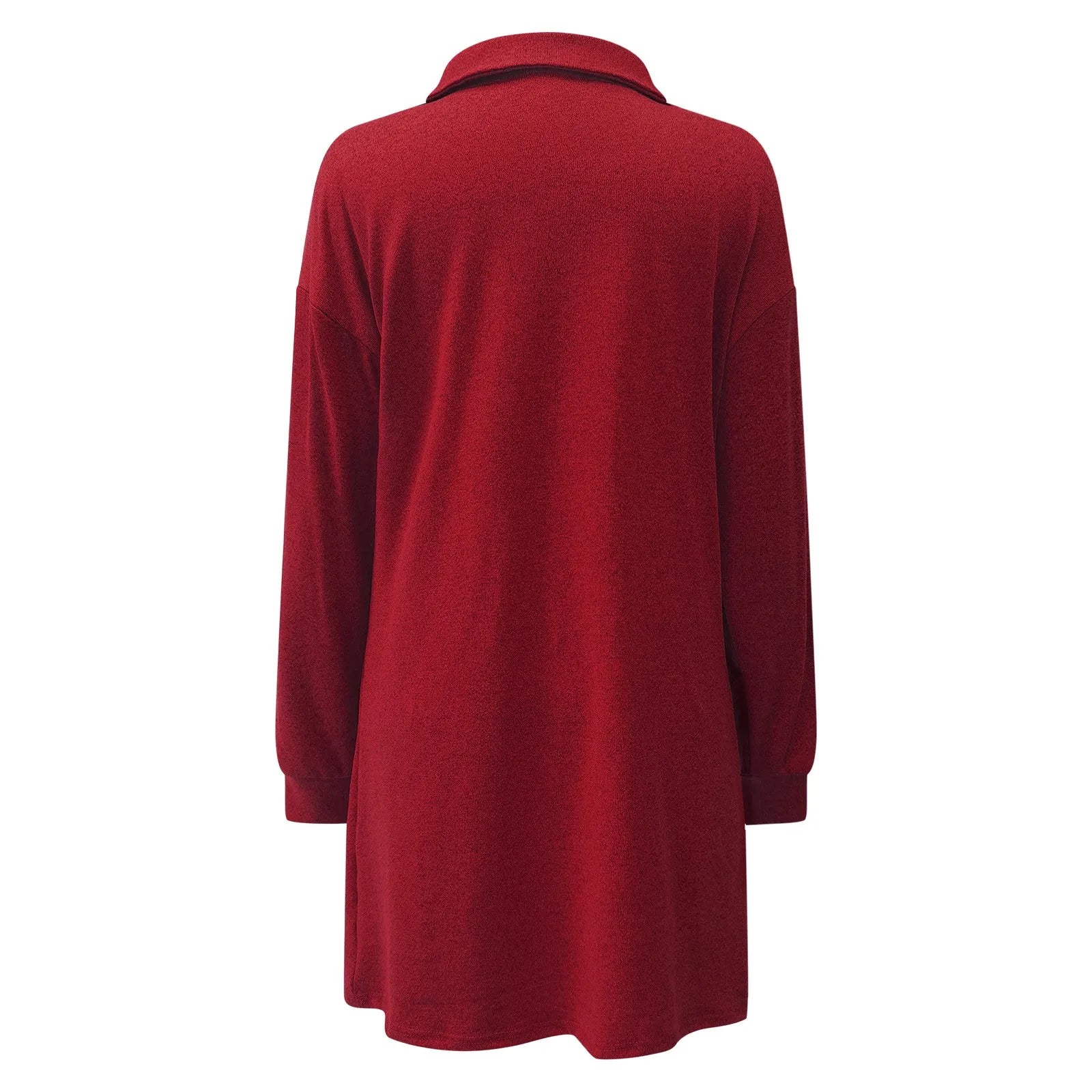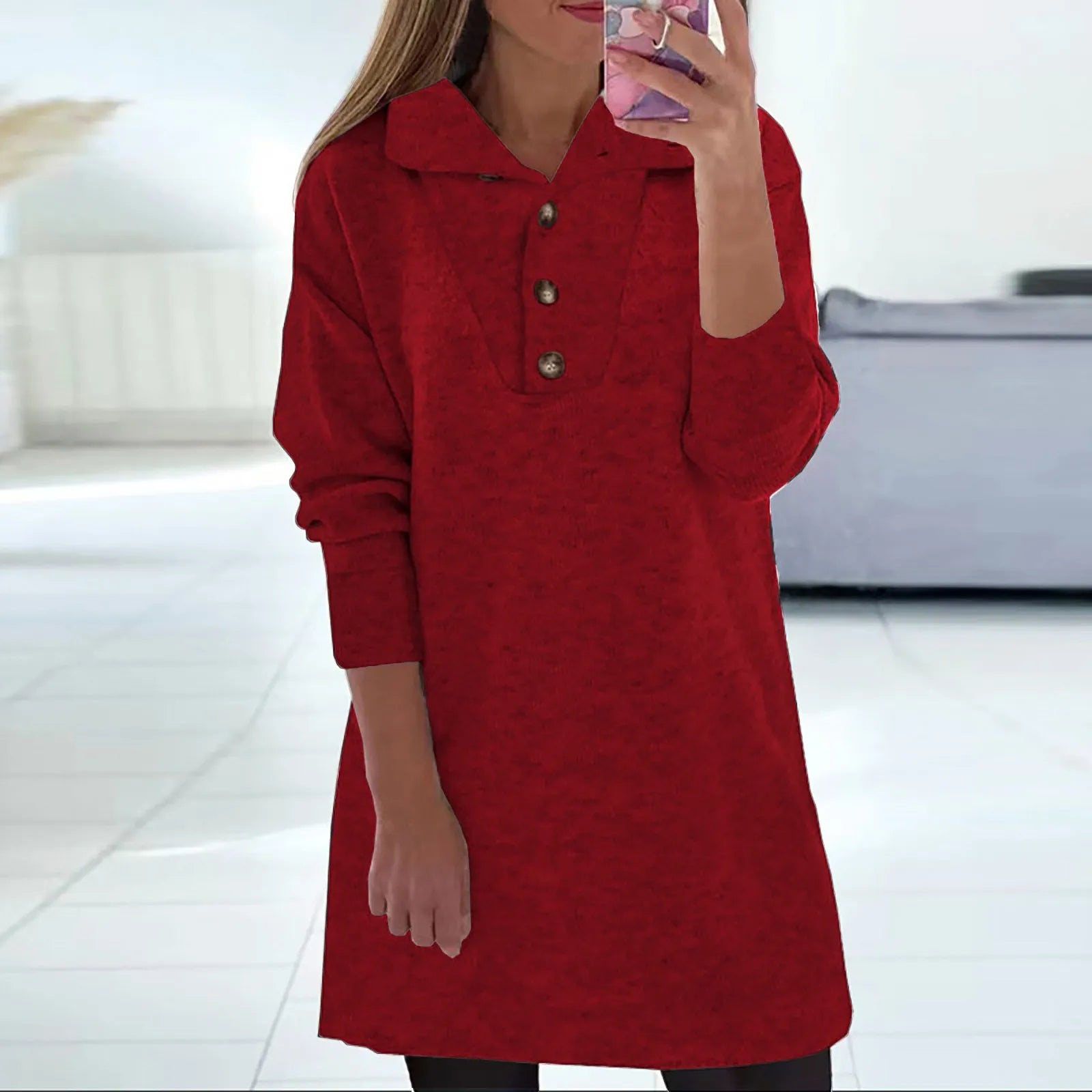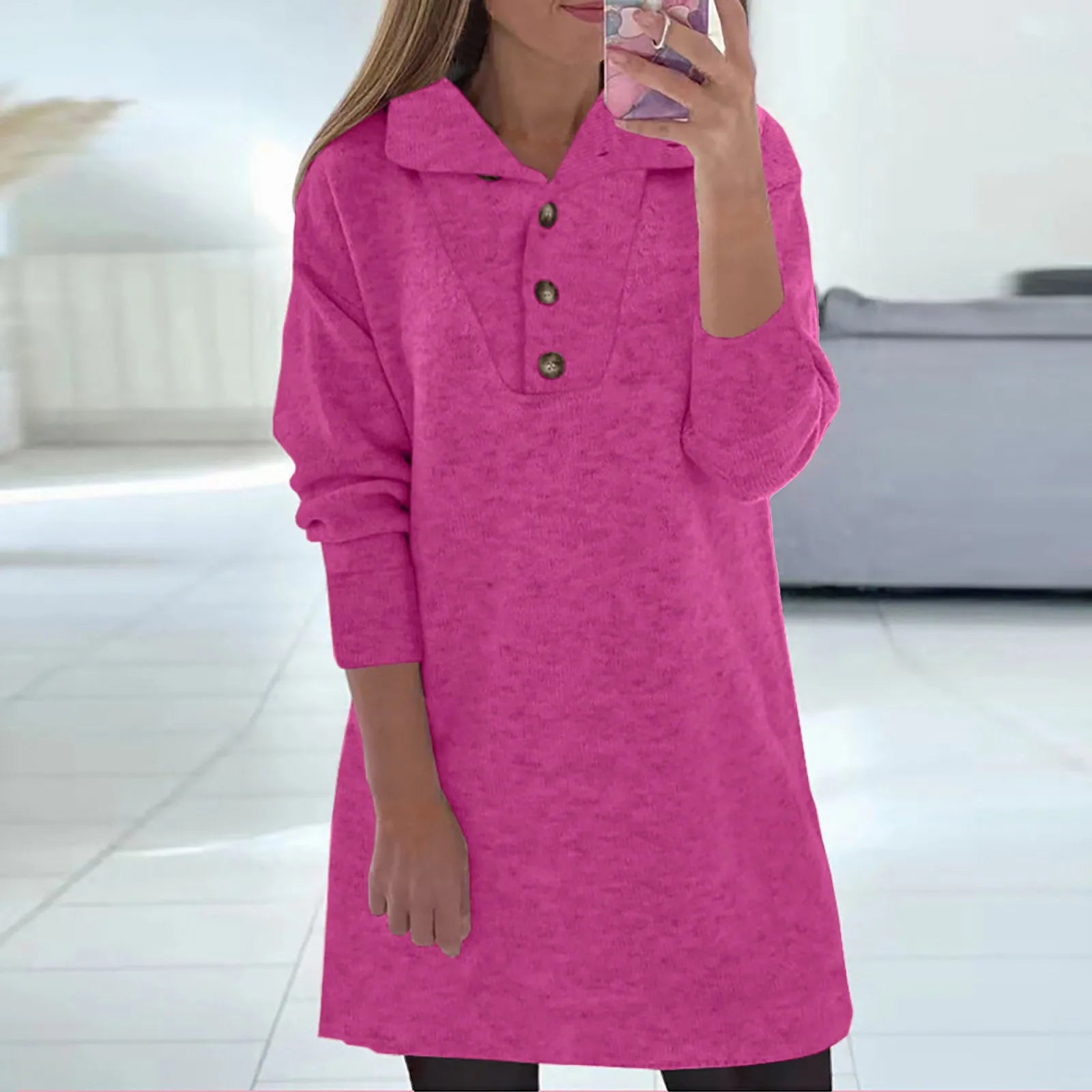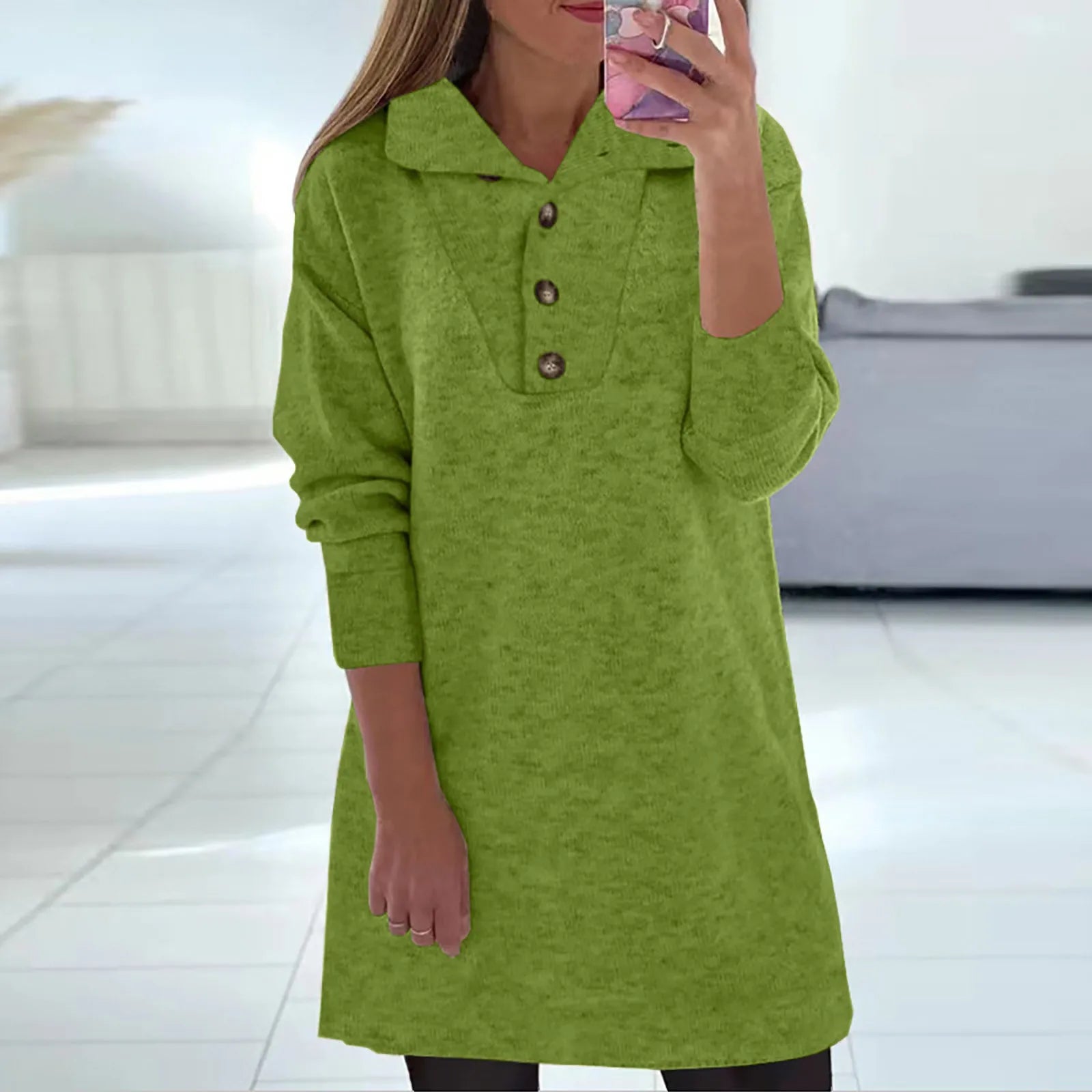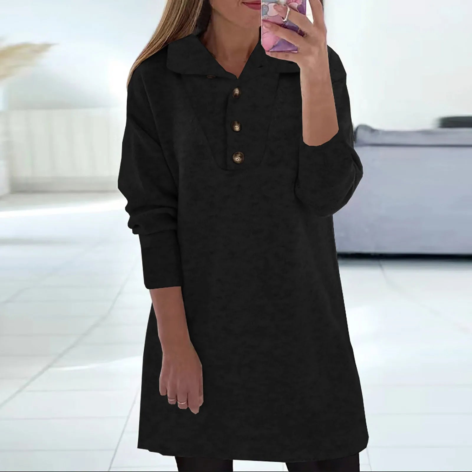 Women Pure Color Lapel Buttons Long Sleeved Casual Dress