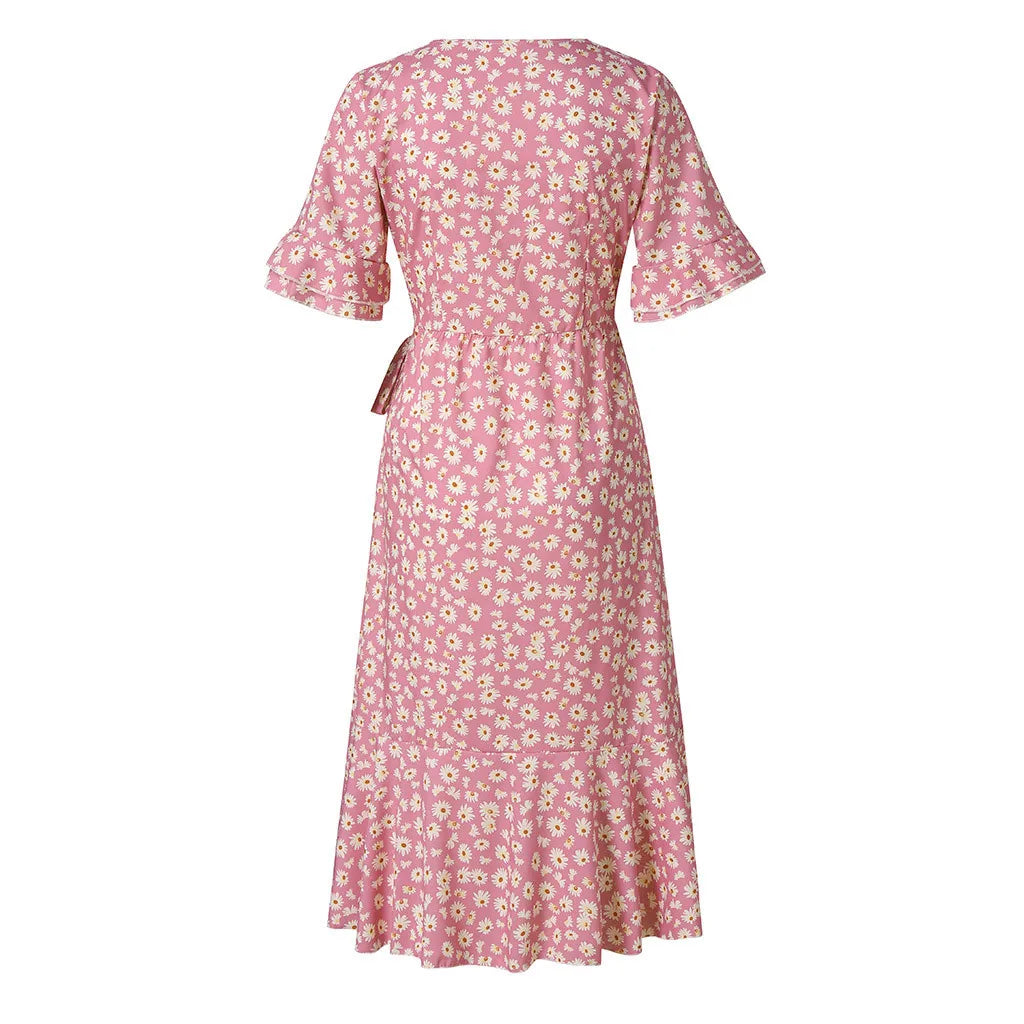 Women Sexy V Neck Short Sleeve Lace Up Floral Print Flowy Summer Dress Sundress