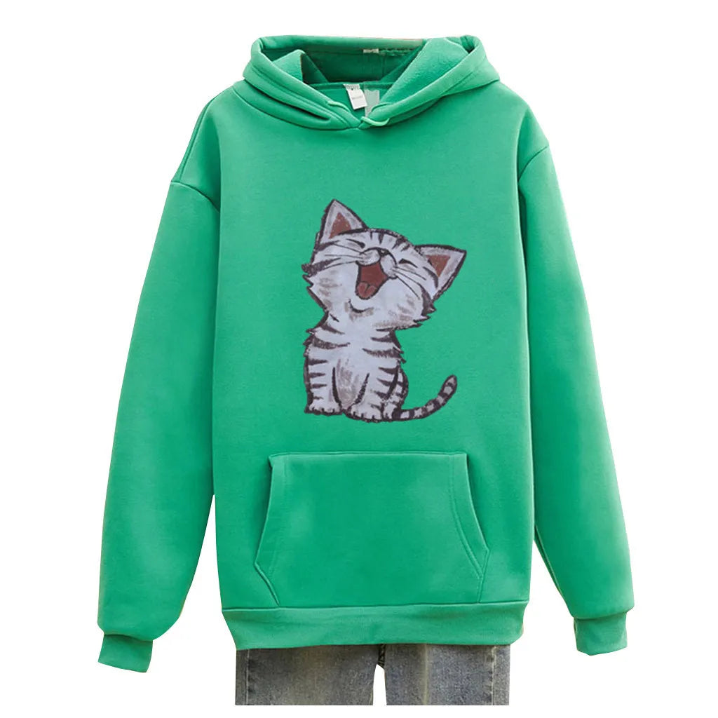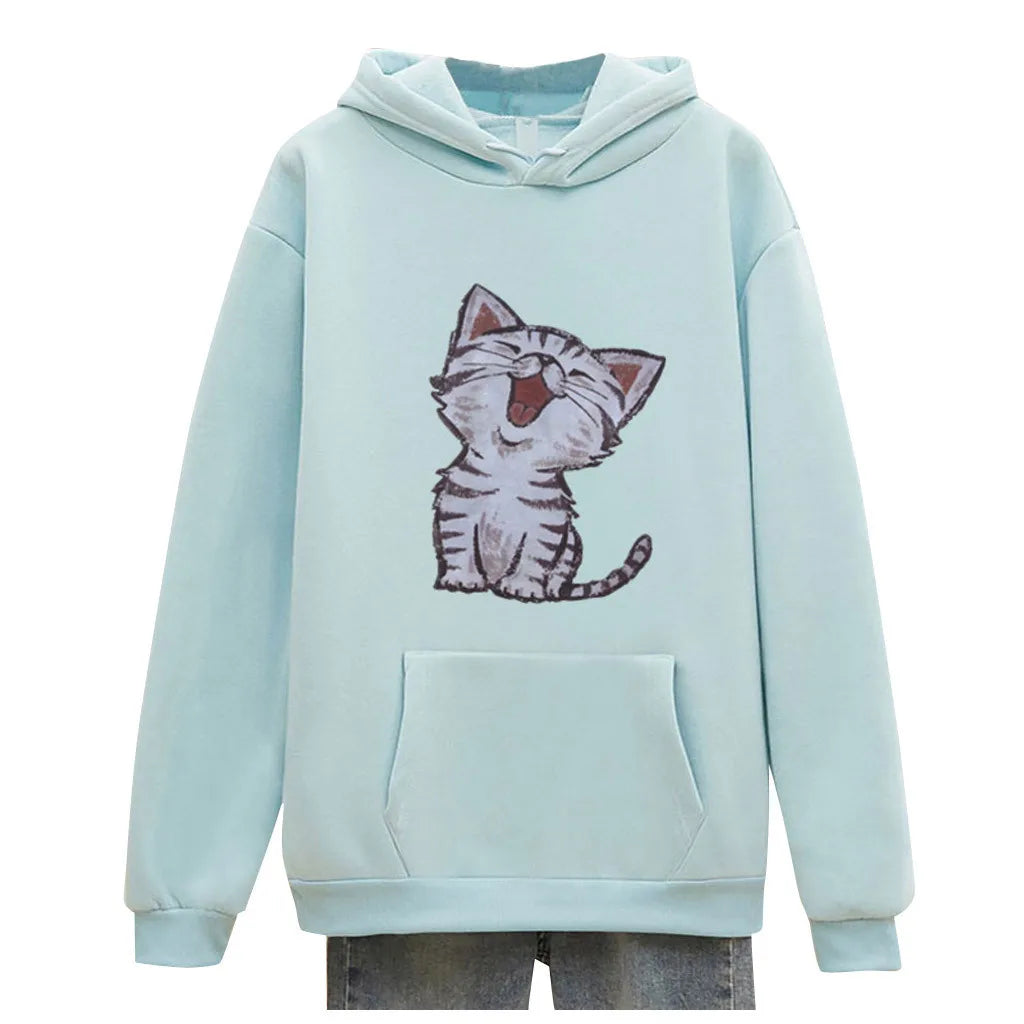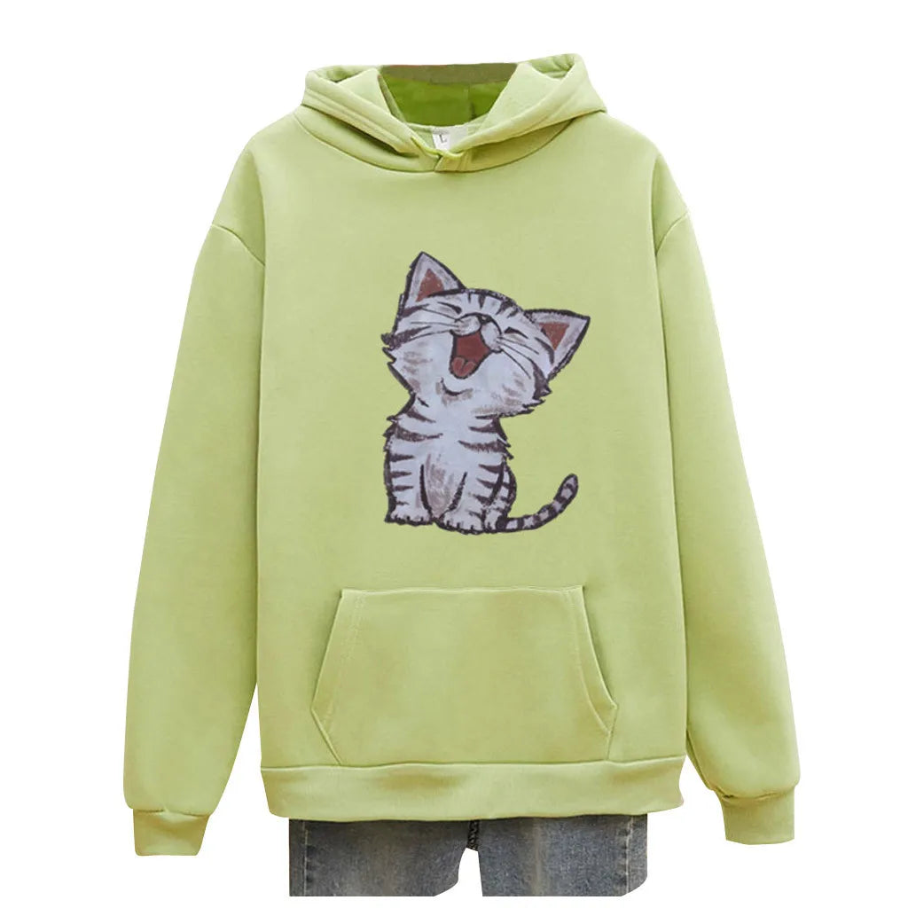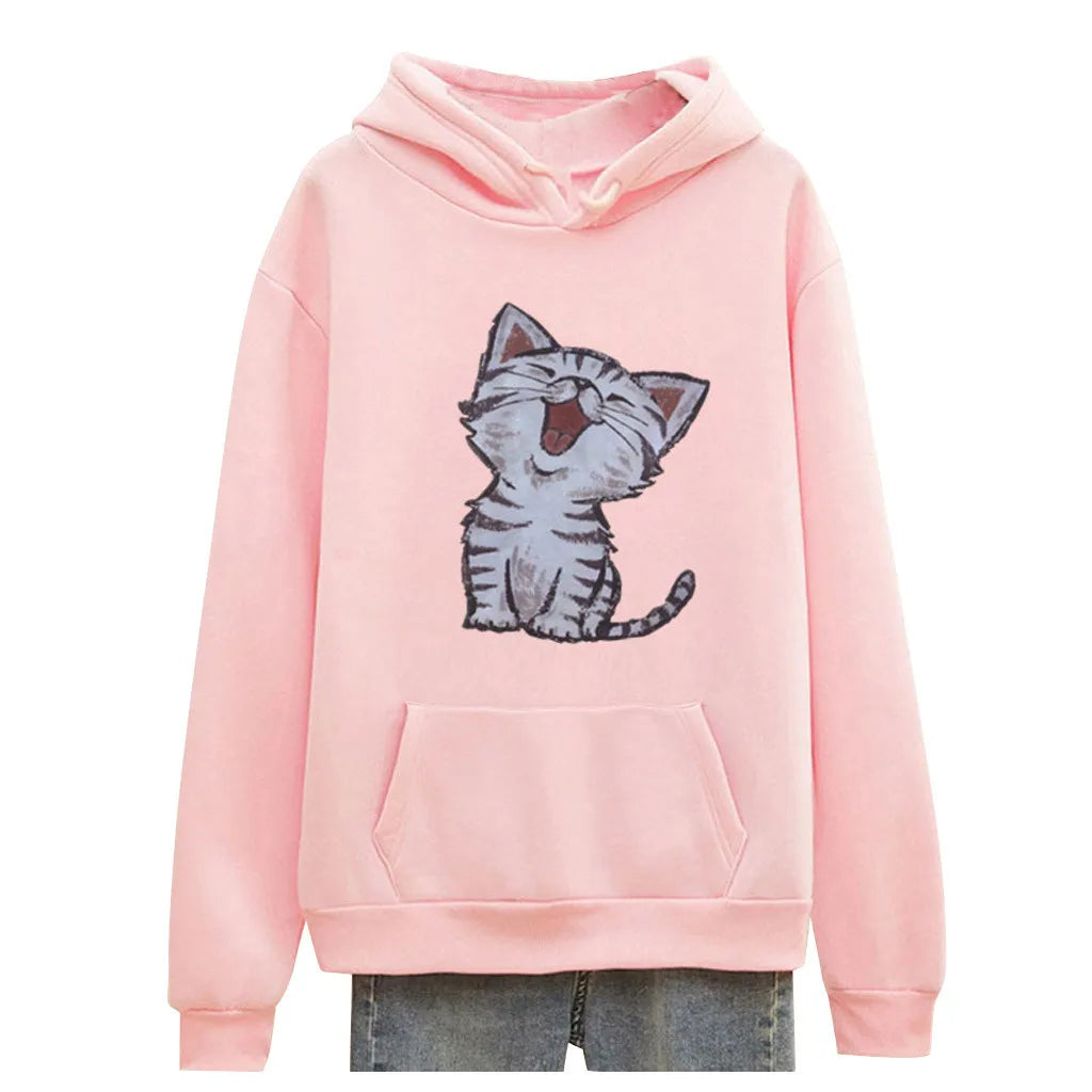 Women Long Sleeve Hoodies Cat Print Casual Hooded Sweatshirt Pullover Top Blouse