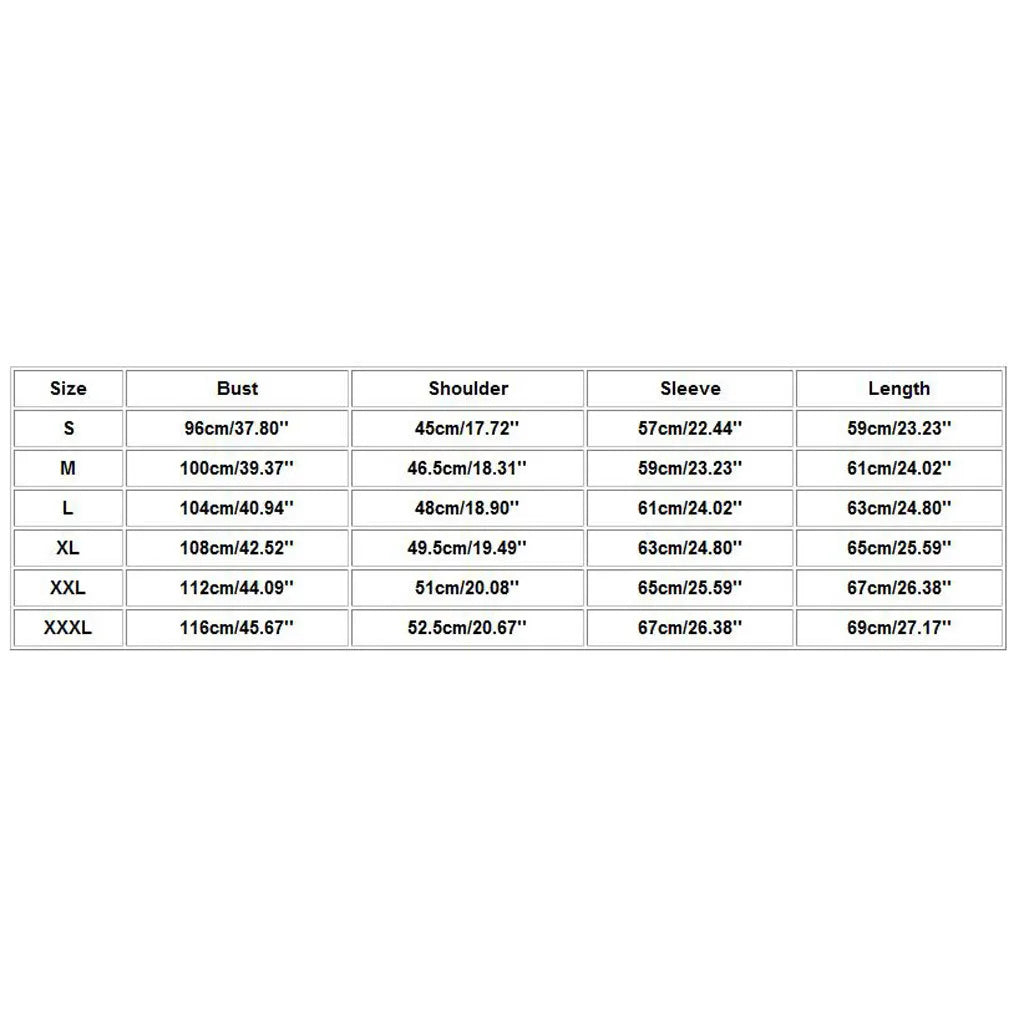 Size Bust Shoulder Sleeve Length S 96cm/37.80'' 45cm/17.72'' 57cm/22.44'' 59cm/23.23'' M 100cm/39.37'' 46.5cm/18.31'' 59cm/23.23'' 61cm/24.02'' L 104cm/40.94'' 48cm/18.90'' 61cm/24.02'' 63cm/24.80'' XL 108cm/42.52'' 49.5cm/19.49'' 63cm/24.80'' 65cm/25.59'' XXL 112cm/44.09'' 51cm/20.08'' 65cm/25.59'' 67cm/26.38'' XXXL 116cm/45.67'' 52.5cm/20.67'' 67cm/26.38'' 69cm/27.17'' Size:S Bust:96cm/37.80'' Shoulder:45cm/17.72'' Sleeve:57cm/22.44'' Length:59cm/23.23'' Size:M Bust:100cm/39.37'' Shoulder:46.5cm/18.31'' Sleeve:59cm/23.23'' Length:61cm/24.02'' Size:L Bust:104cm/40.94'' Shoulder:48cm/18.90'' Sleeve:61cm/24.02'' Length:63cm/24.80'' Size:XL Bust:108cm/42.52'' Shoulder:49.5cm/19.49'' Sleeve:63cm/24.80'' Length:65cm/25.59'' Size:XXL Bust:112cm/44.09'' Shoulder:51cm/20.08'' Sleeve:65cm/25.59'' Length:67cm/26.38'' Size:XXXL Bust:116cm/45.67'' Shoulder:52.5cm/20.67'' Sleeve:67cm/26.38'' Length:69cm/27.17''