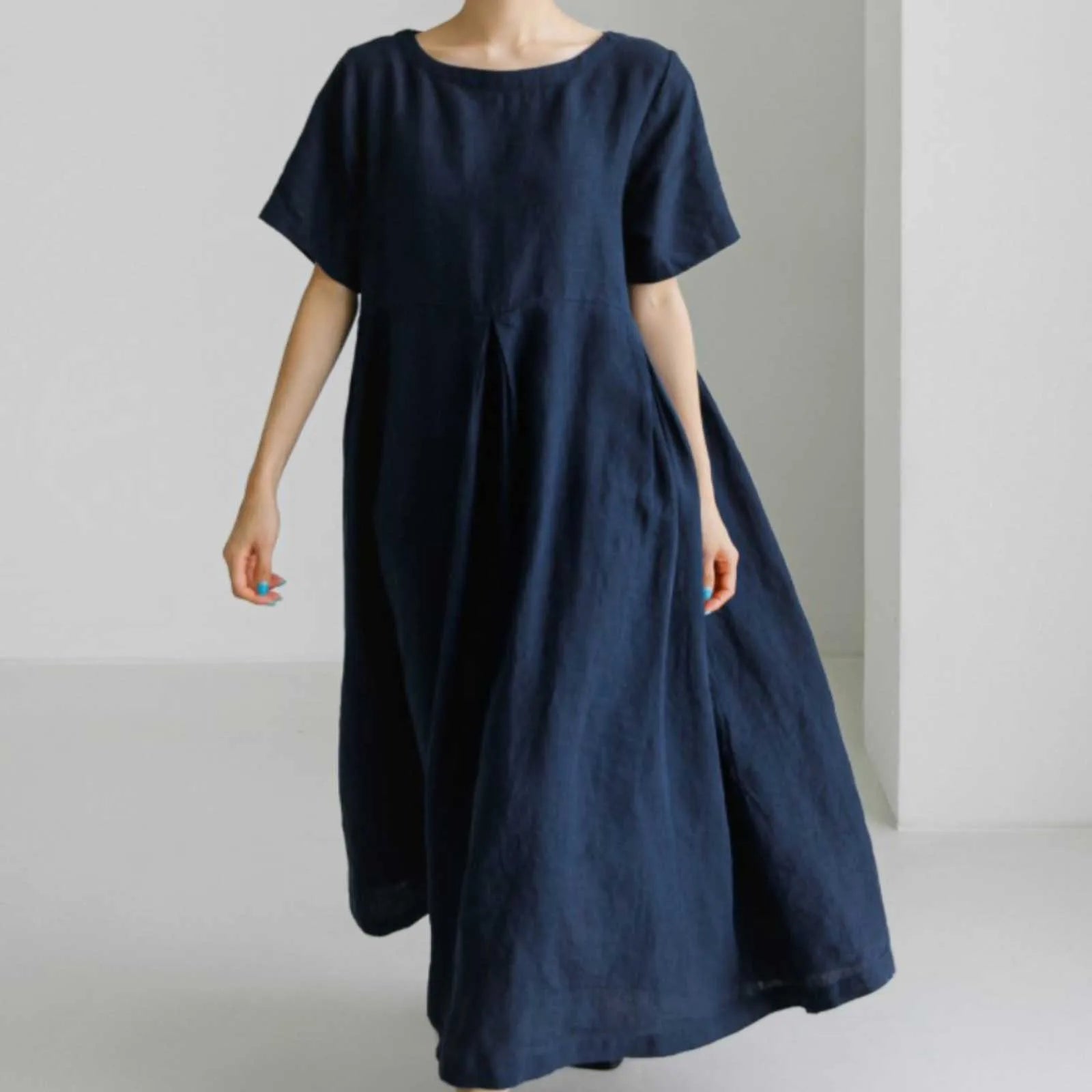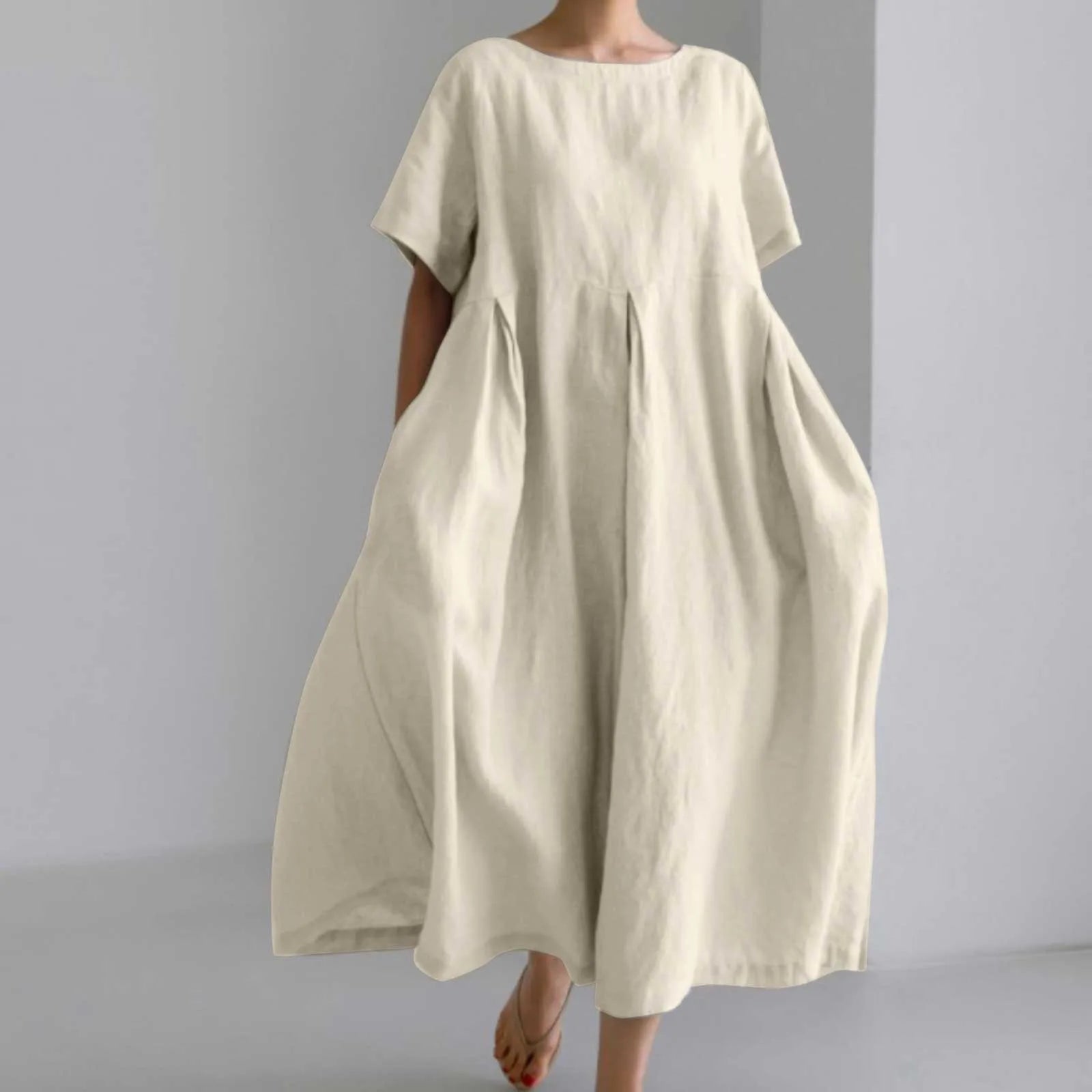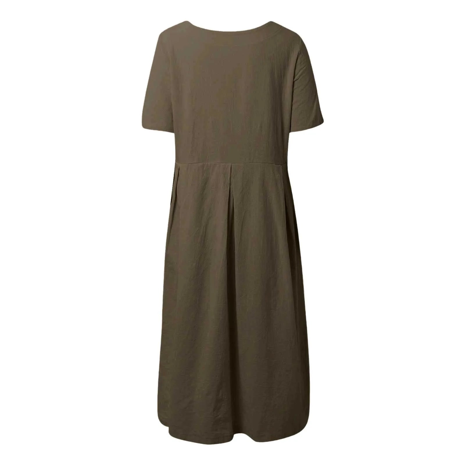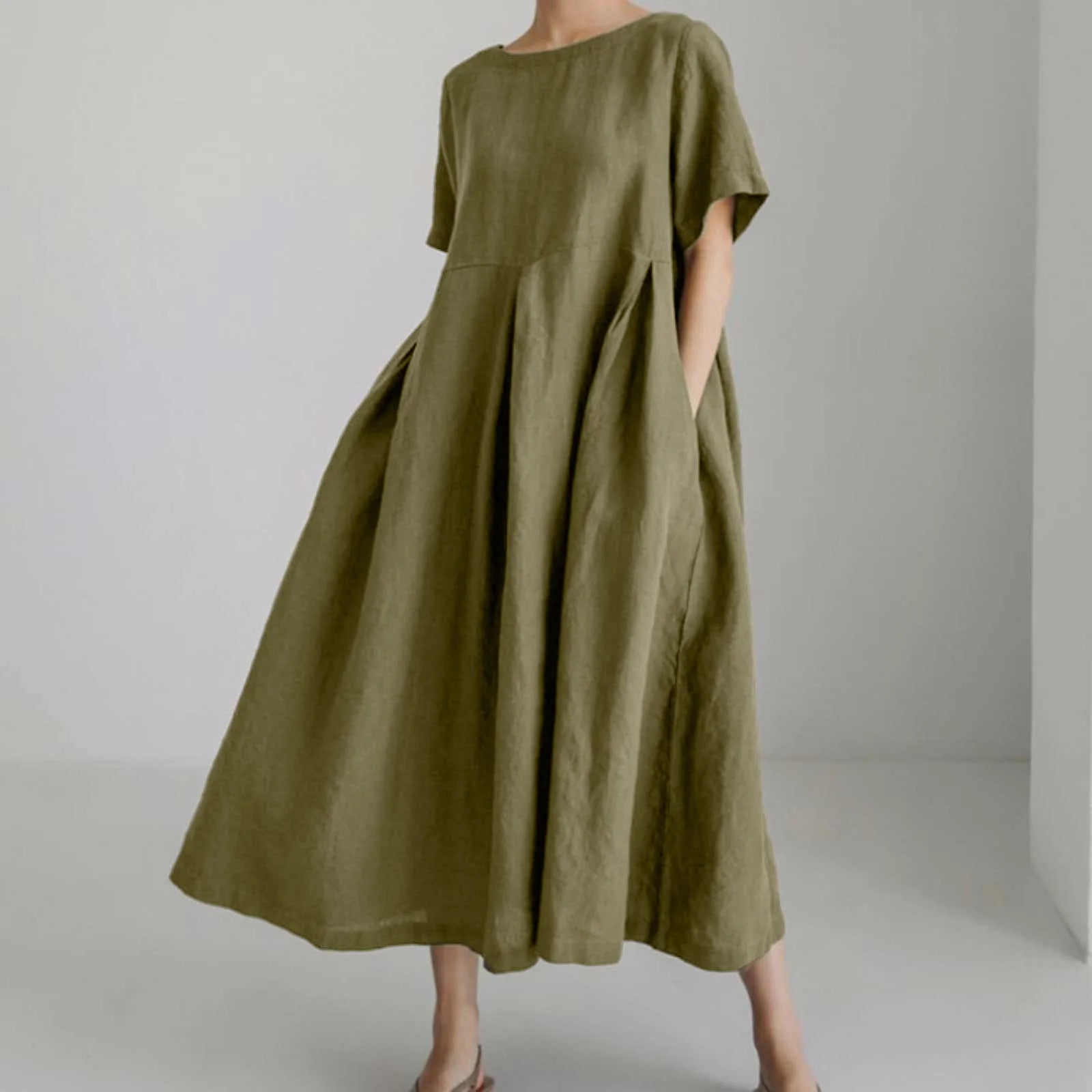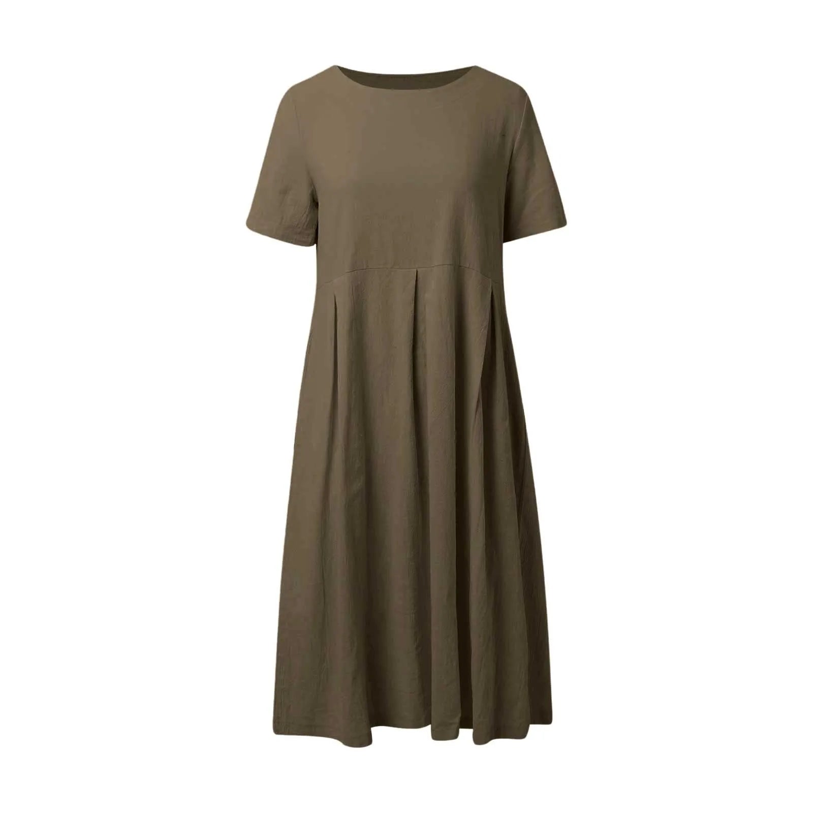 Women Fashion Solid Loose Dress Pullover Round Neck Over The Knee Long Skirt