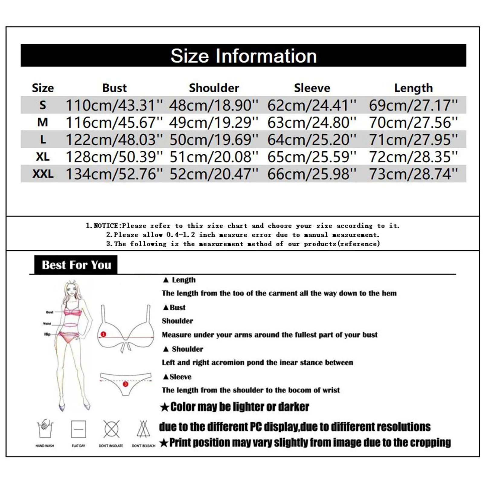 Size Bust Shoulder Sleeve Length S 110cm/43.31'' 48cm/18.90'' 62cm/24.41'' 69cm/27.17'' M 116cm/45.67'' 49cm/19.29'' 63cm/24.80'' 70cm/27.56'' L 122cm/48.03'' 50cm/19.69'' 64cm/25.20'' 71cm/27.95'' XL 128cm/50.39'' 51cm/20.08'' 65cm/25.59'' 72cm/28.35'' XXL 134cm/52.76'' 52cm/20.47'' 66cm/25.98'' 73cm/28.74'' Size:S Bust:110cm/43.31'' Shoulder:48cm/18.90'' Sleeve:62cm/24.41'' Length:69cm/27.17'' Size:M Bust:116cm/45.67'' Shoulder:49cm/19.29'' Sleeve:63cm/24.80'' Length:70cm/27.56'' Size:L Bust:122cm/48.03'' Shoulder:50cm/19.69'' Sleeve:64cm/25.20'' Length:71cm/27.95'' Size:XL Bust:128cm/50.39'' Shoulder:51cm/20.08'' Sleeve:65cm/25.59'' Length:72cm/28.35'' Size:XXL Bust:134cm/52.76'' Shoulder:52cm/20.47'' Sleeve:66cm/25.98'' Length:73cm/28.74''