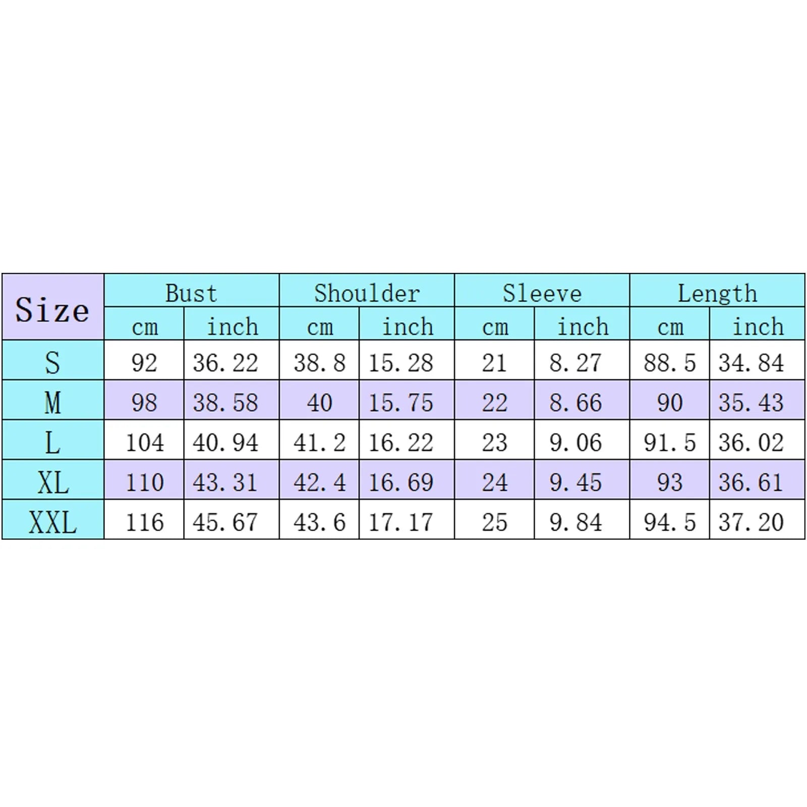 Size Bust Shoulder Sleeve Length S 92cm/36.22'' 38.8cm/15.28'' 21cm/8.27'' 88.5cm/34.84'' M 98cm/38.58'' 40cm/15.75'' 22cm/8.66'' 90cm/35.43'' L 104cm/40.94'' 41.2cm/16.22'' 23cm/9.06'' 91.5cm/36.02'' XL 110cm/43.31'' 42.4cm/16.69'' 24cm/9.45'' 93cm/36.61'' XXL 116cm/45.67'' 43.6cm/17.17'' 25cm/9.84'' 94.5cm/37.20'' Size:S Bust:92cm/36.22'' Shoulder:38.8cm/15.28'' Sleeve:21cm/8.27'' Length:88.5cm/34.84'' Size:M Bust:98cm/38.58'' Shoulder:40cm/15.75'' Sleeve:22cm/8.66'' Length:90cm/35.43'' Size:L Bust:104cm/40.94'' Shoulder:41.2cm/16.22'' Sleeve:23cm/9.06'' Length:91.5cm/36.02'' Size:XL Bust:110cm/43.31'' Shoulder:42.4cm/16.69'' Sleeve:24cm/9.45'' Length:93cm/36.61'' Size:XXL Bust:116cm/45.67'' Shoulder:43.6cm/17.17'' Sleeve:25cm/9.84'' Length:94.5cm/37.20''