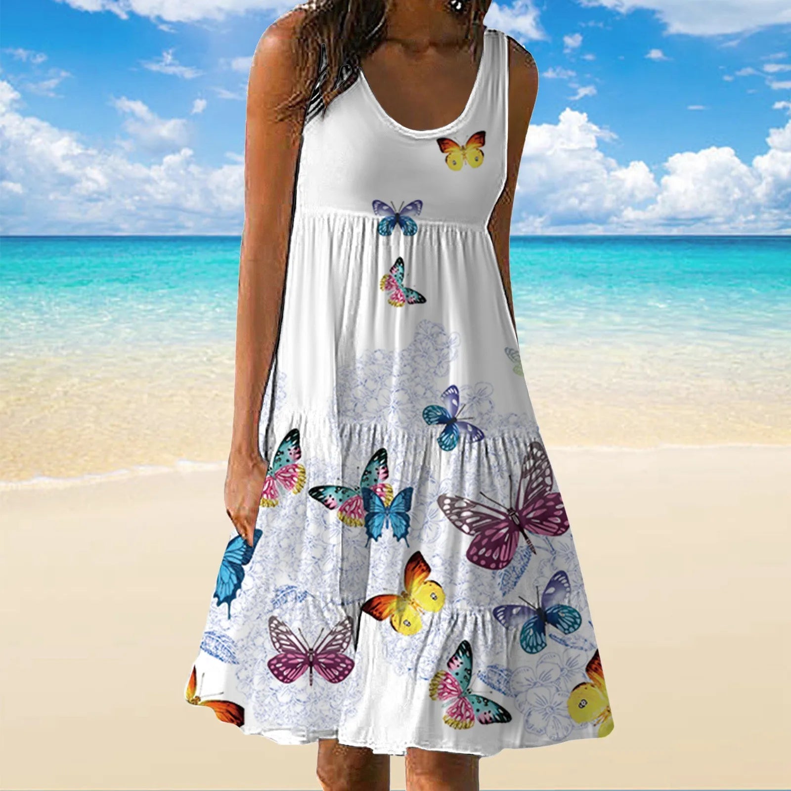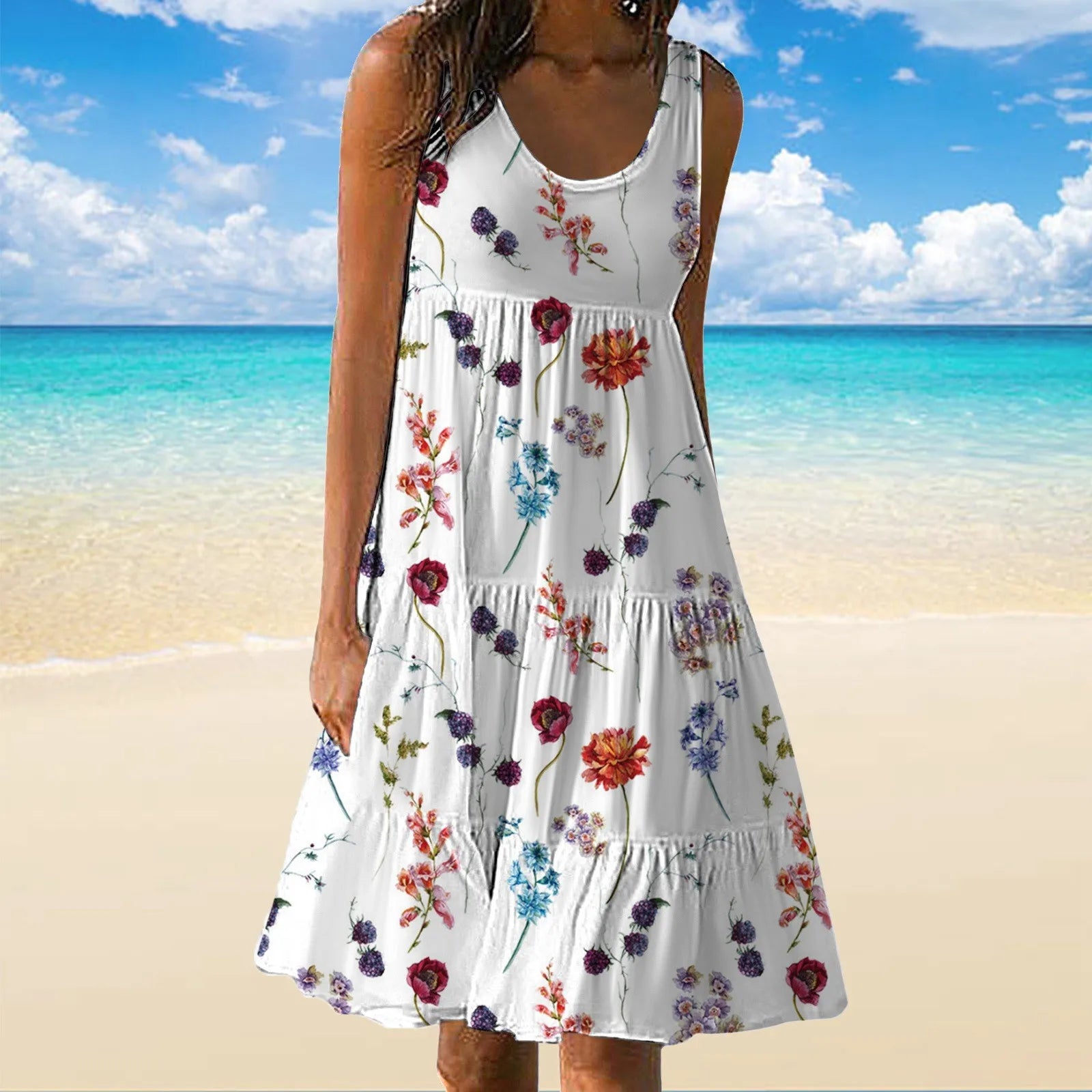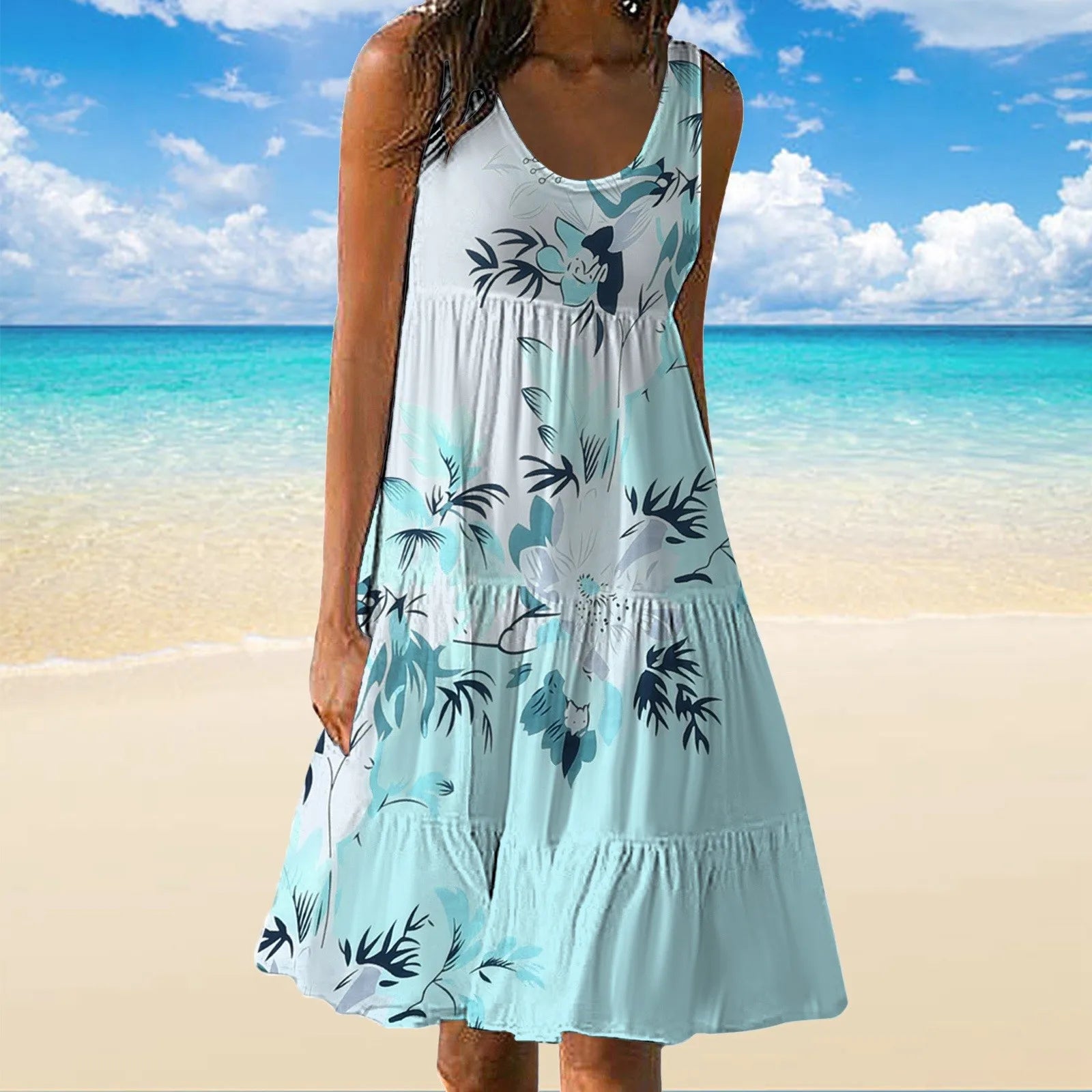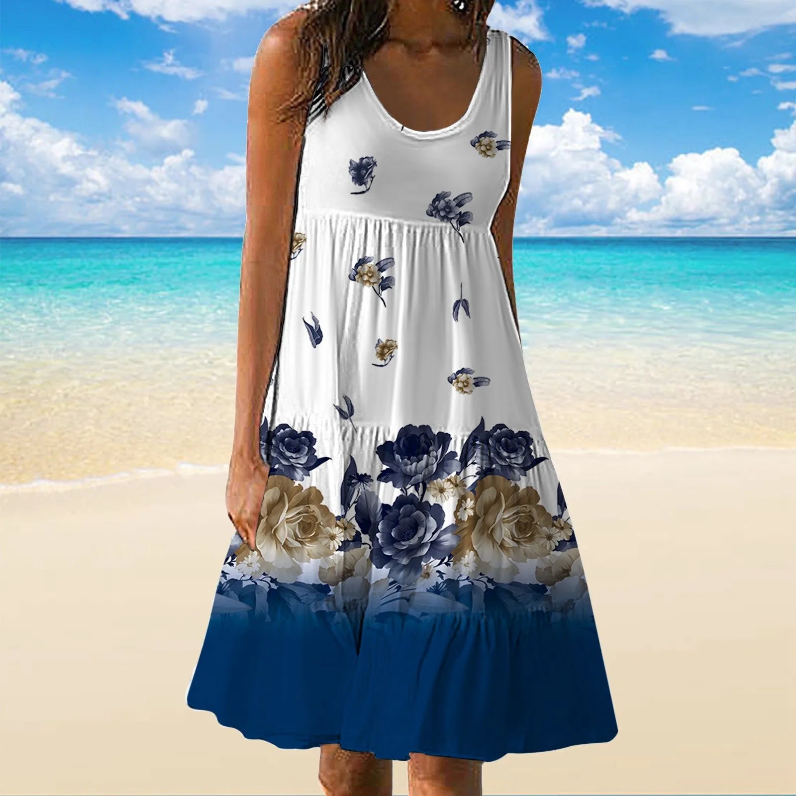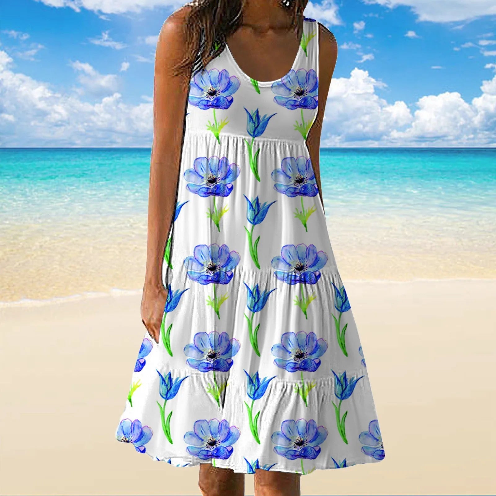 Women Summer Casual Dress Crew Neck Sleeveless Tank Dress Beach Dress Swing Dress Fashion Loose Midi Dress