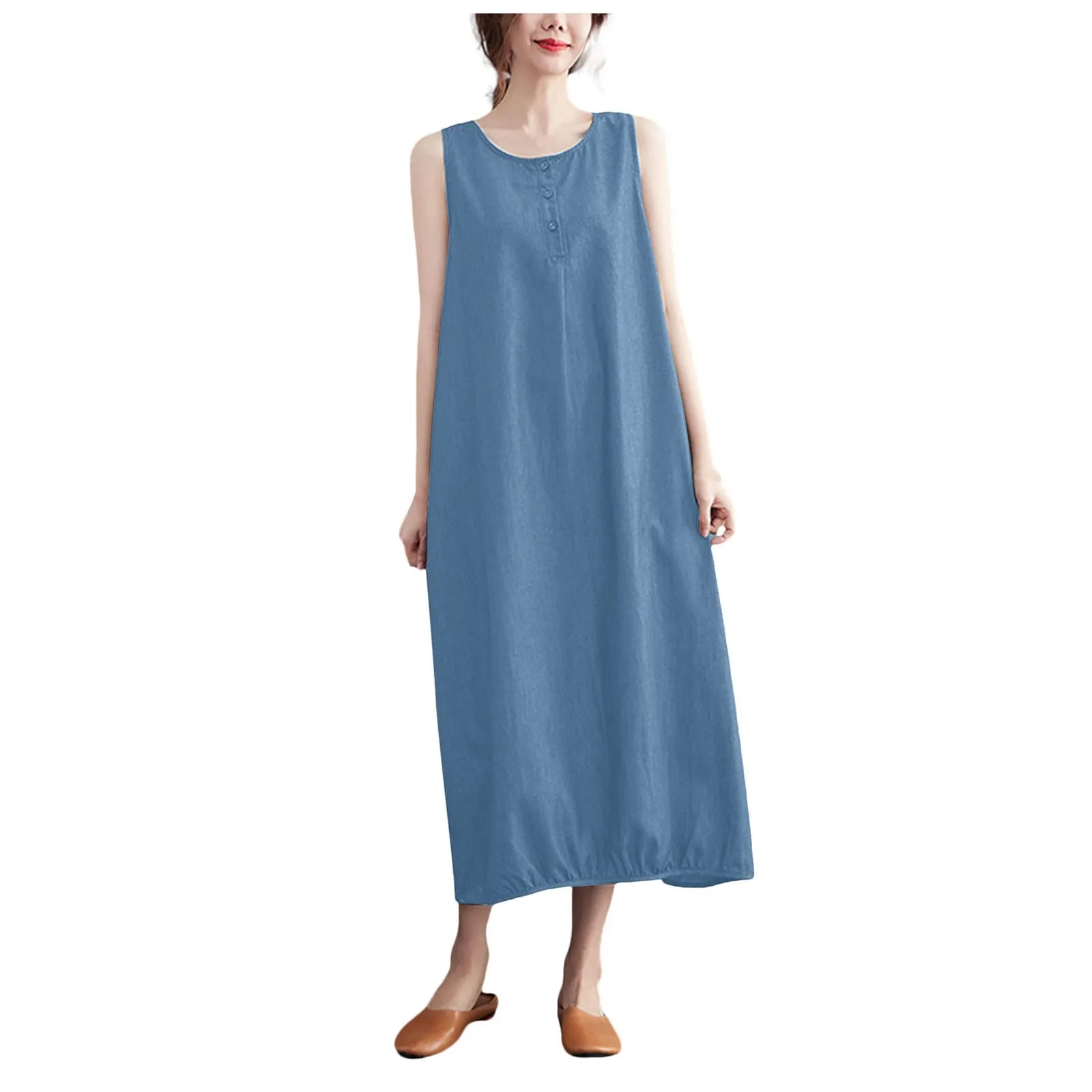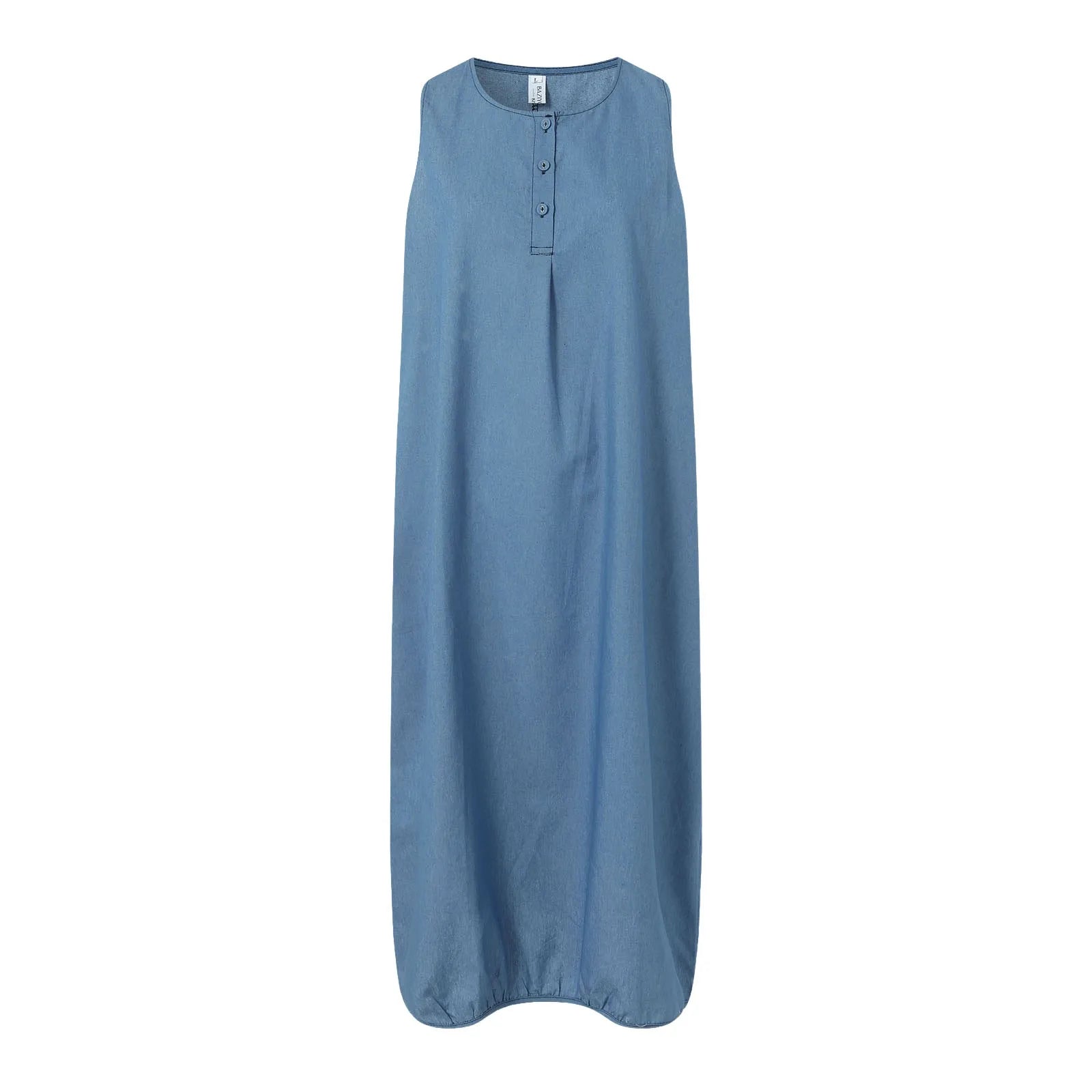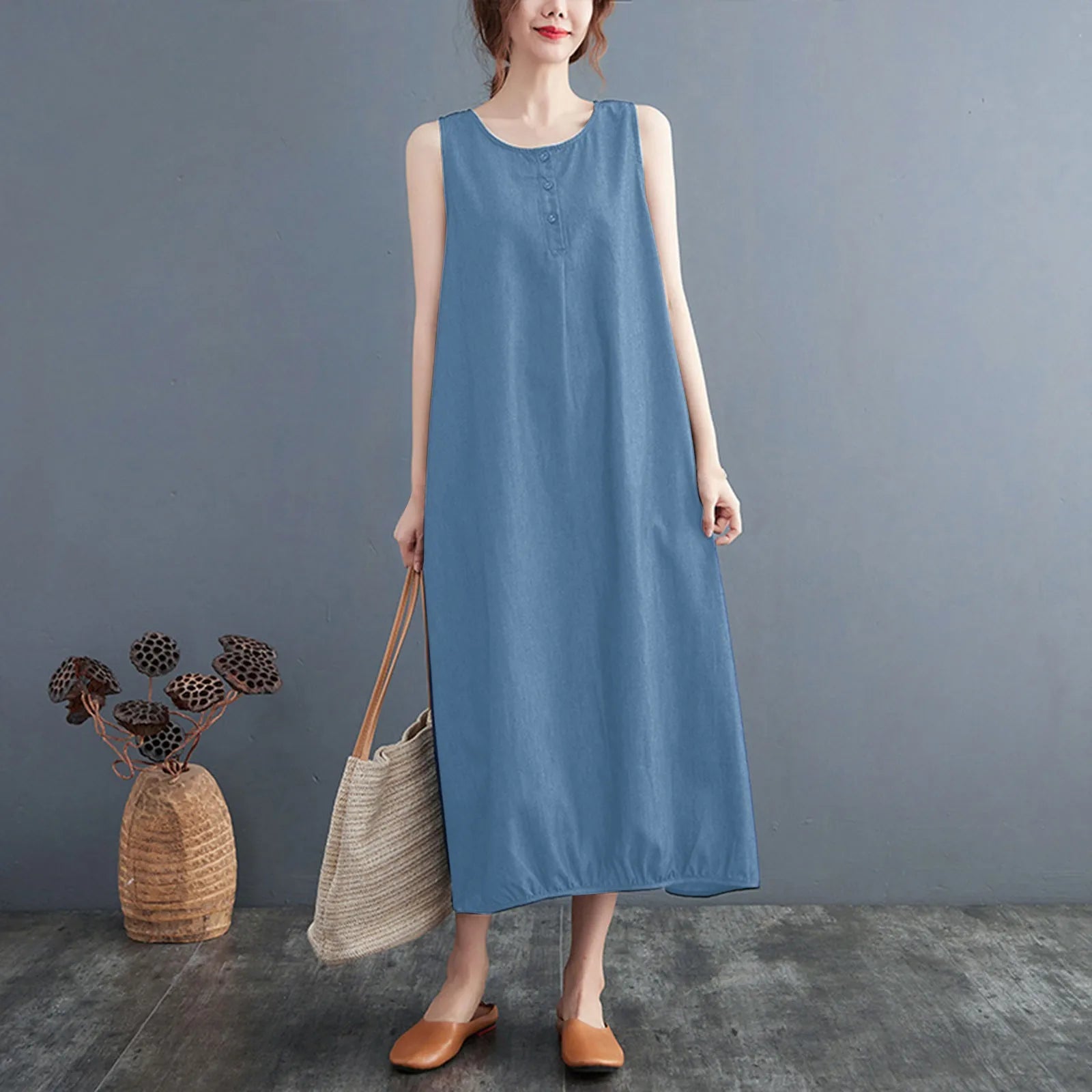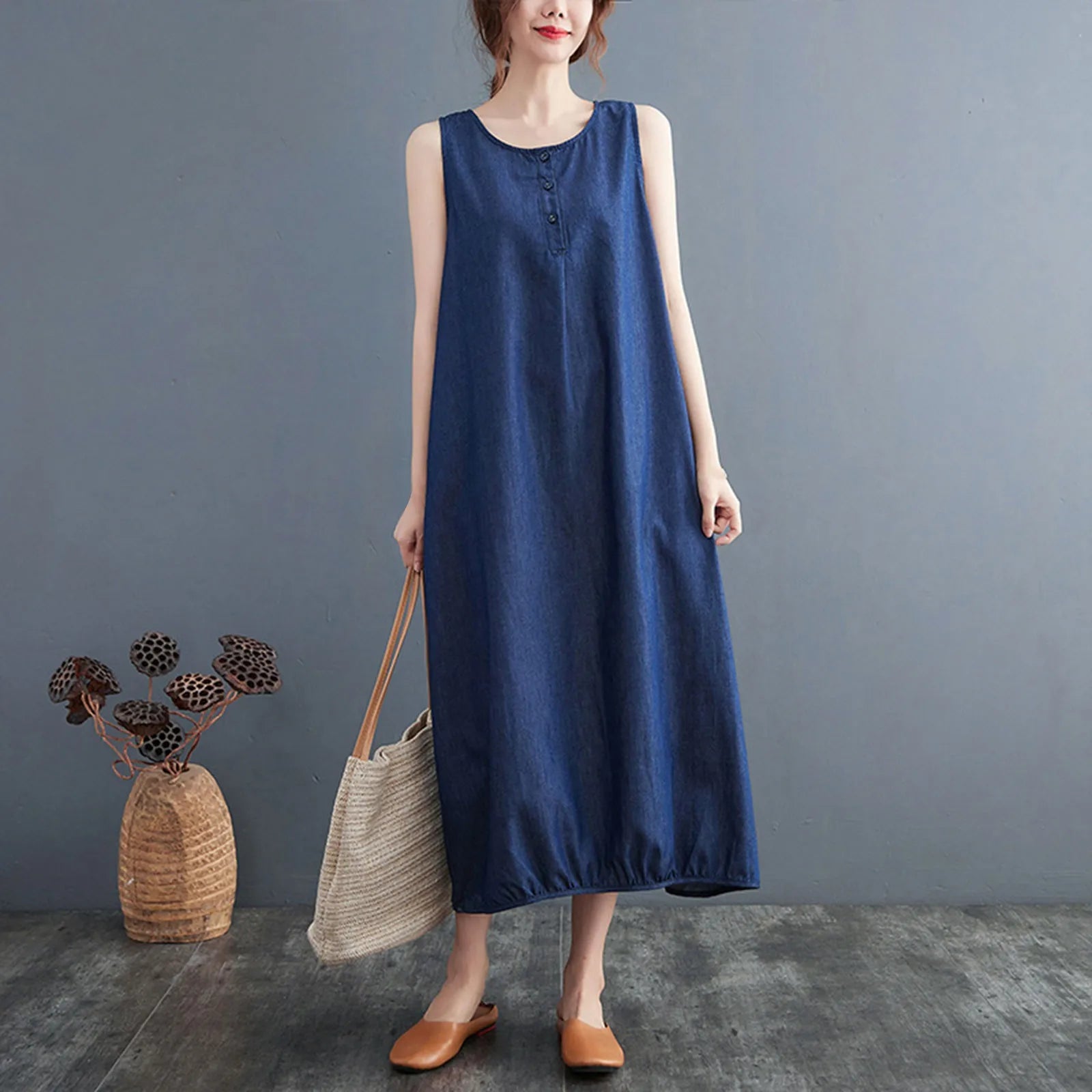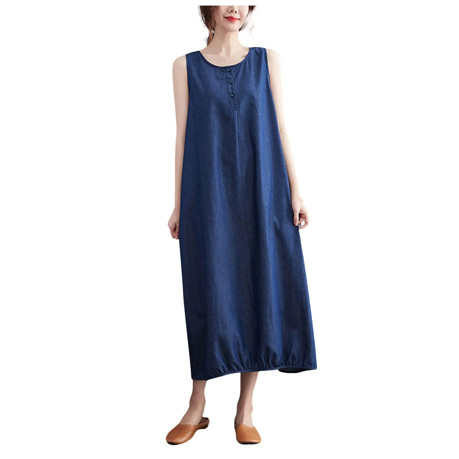 The cool and elegant silhouette is its charm. A versatile sleeveless dress is here. This is a fashionable denim dress that can highlight a mature and casual .