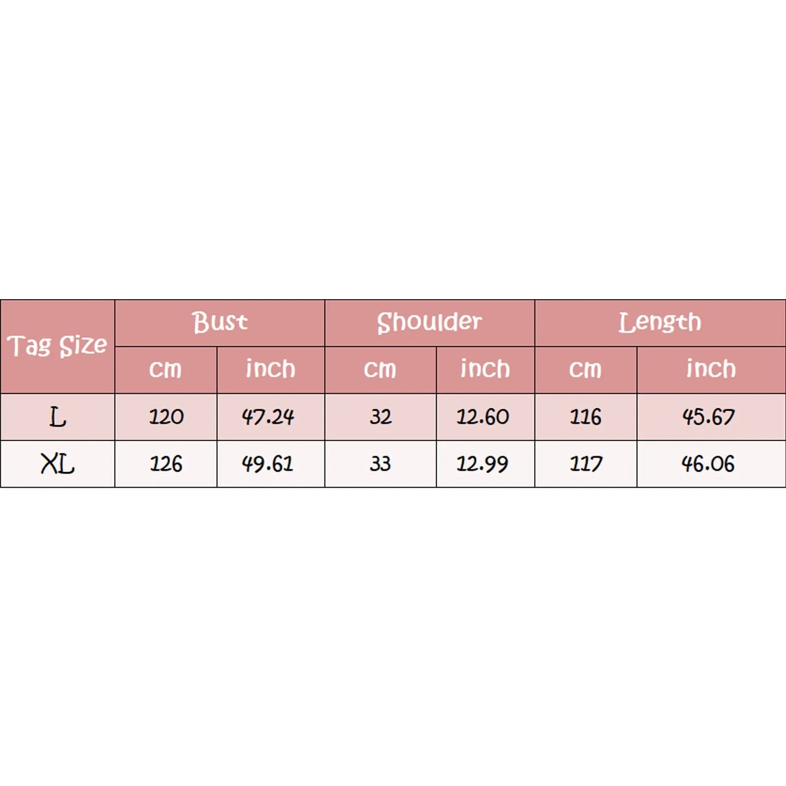 Size Bust Shoulder Length L 120cm/47.24'' 32cm/12.60'' 116cm/45.67'' XL 126cm/49.61'' 33cm/12.99'' 117cm/46.06'' Size:L Bust:120cm/47.24'' Shoulder:32cm/12.60'' Length:116cm/45.67'' Size:XL Bust:126cm/49.61'' Shoulder:33cm/12.99'' Length:117cm/46.06''