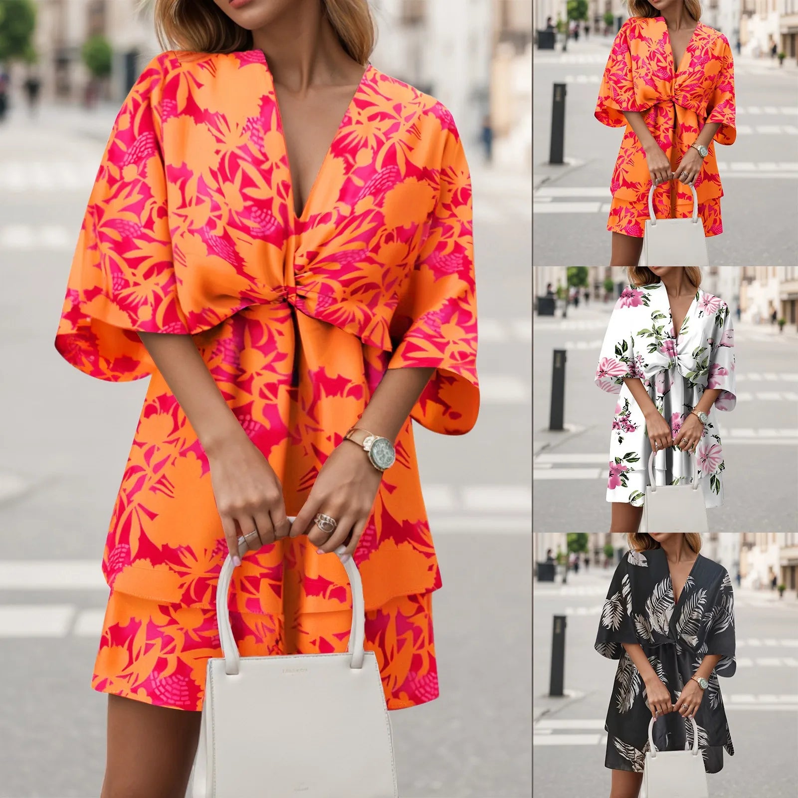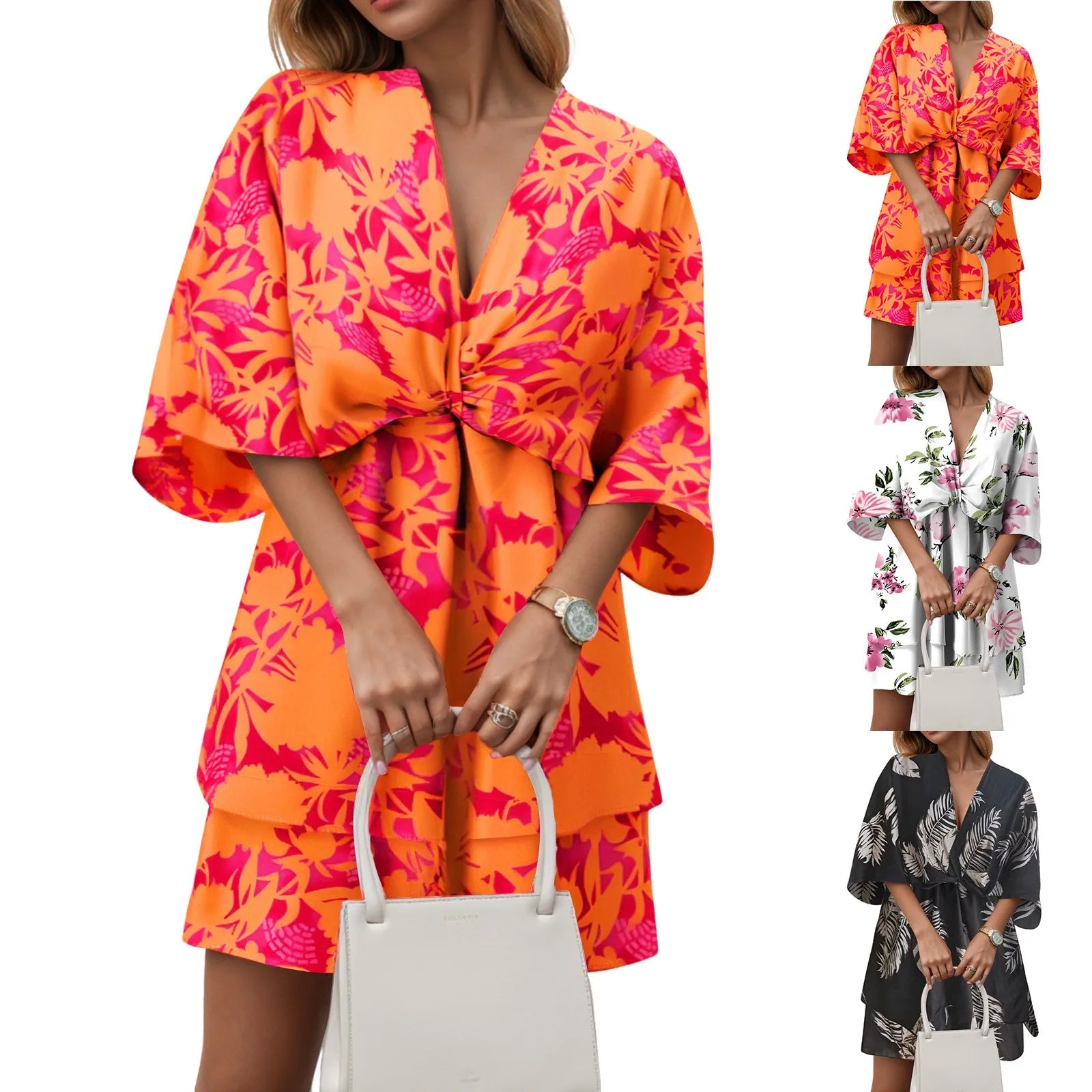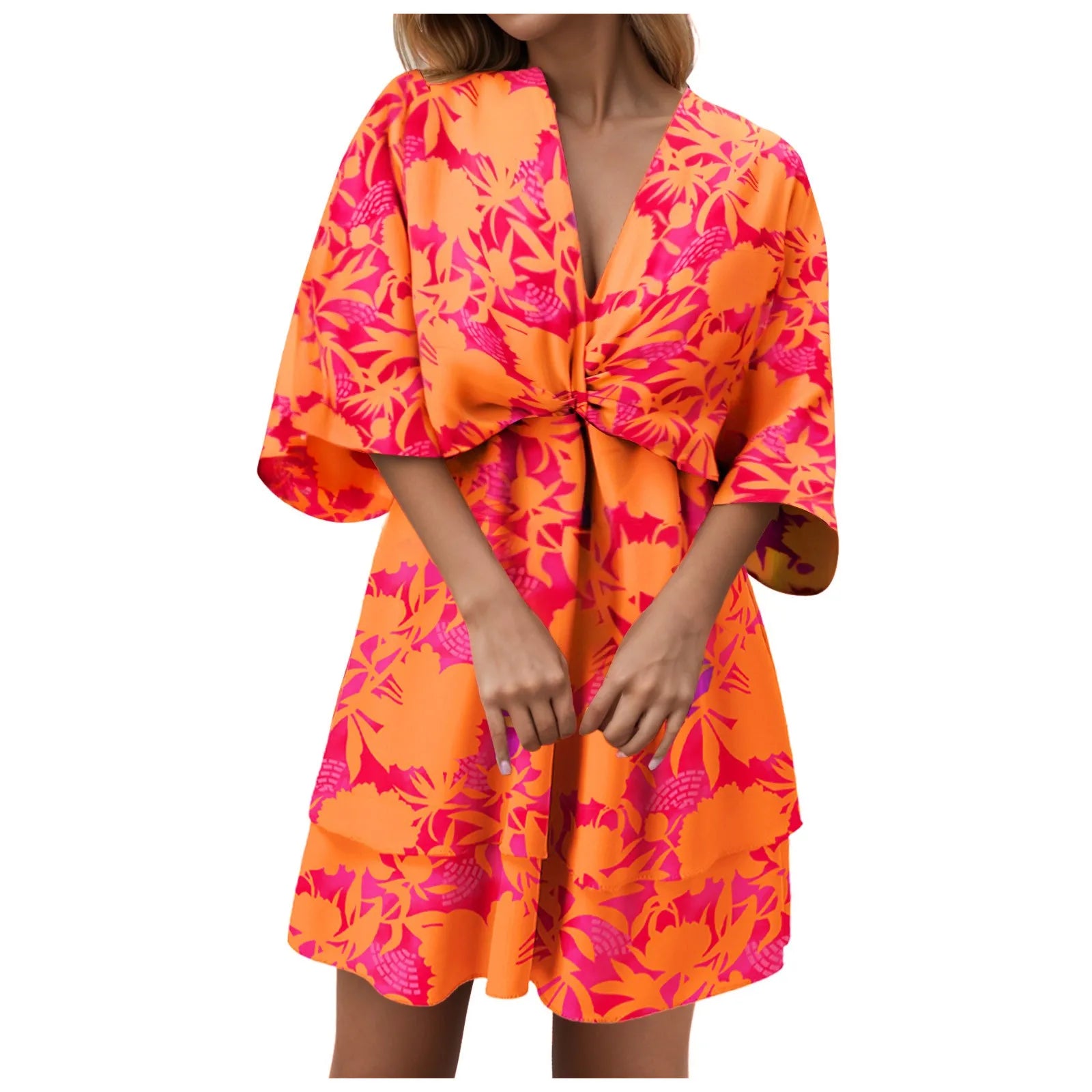 Womens Short A Line Flare Dress Knot Front Short Sleeve Tiered Ruffle Swing Color Printed Mini Dresses