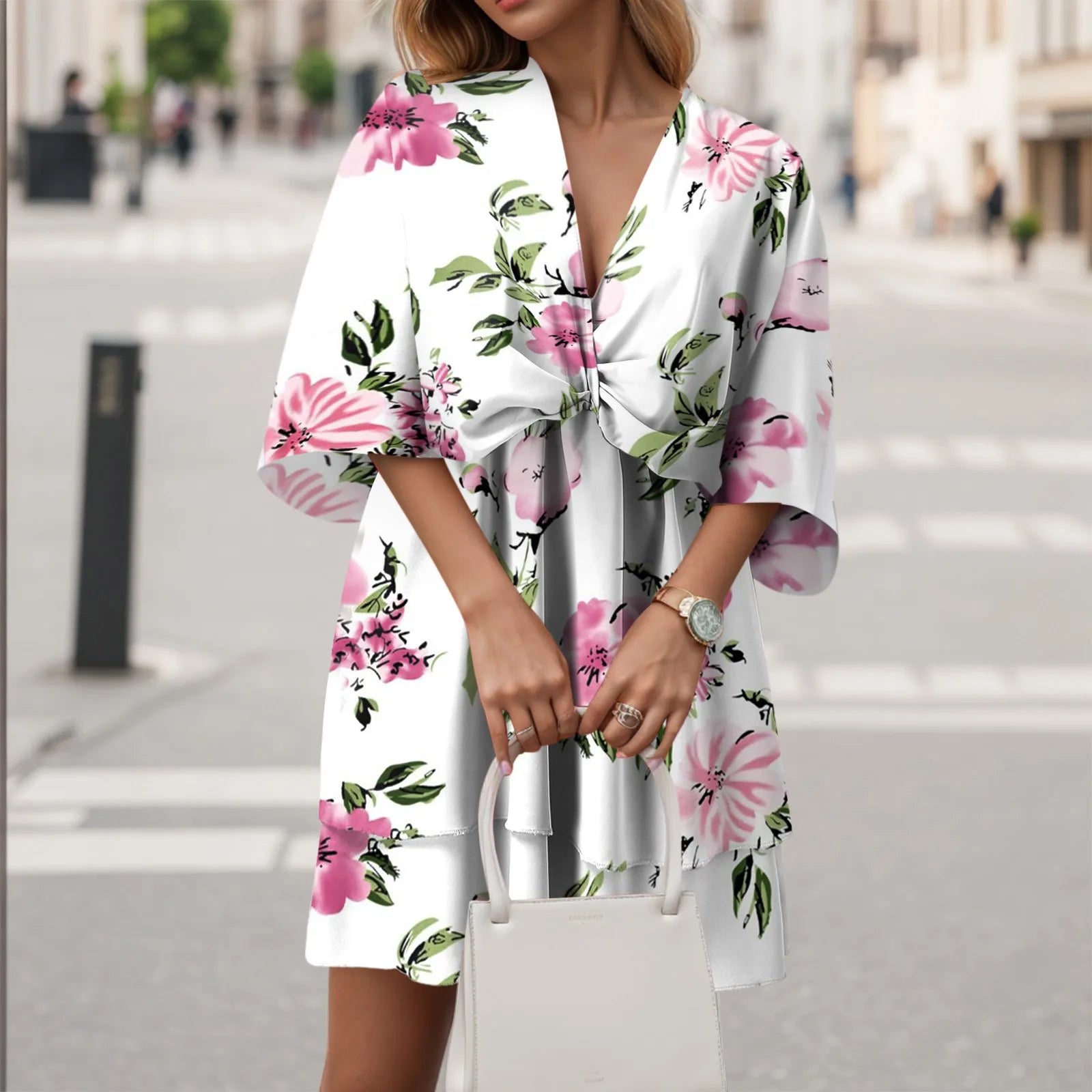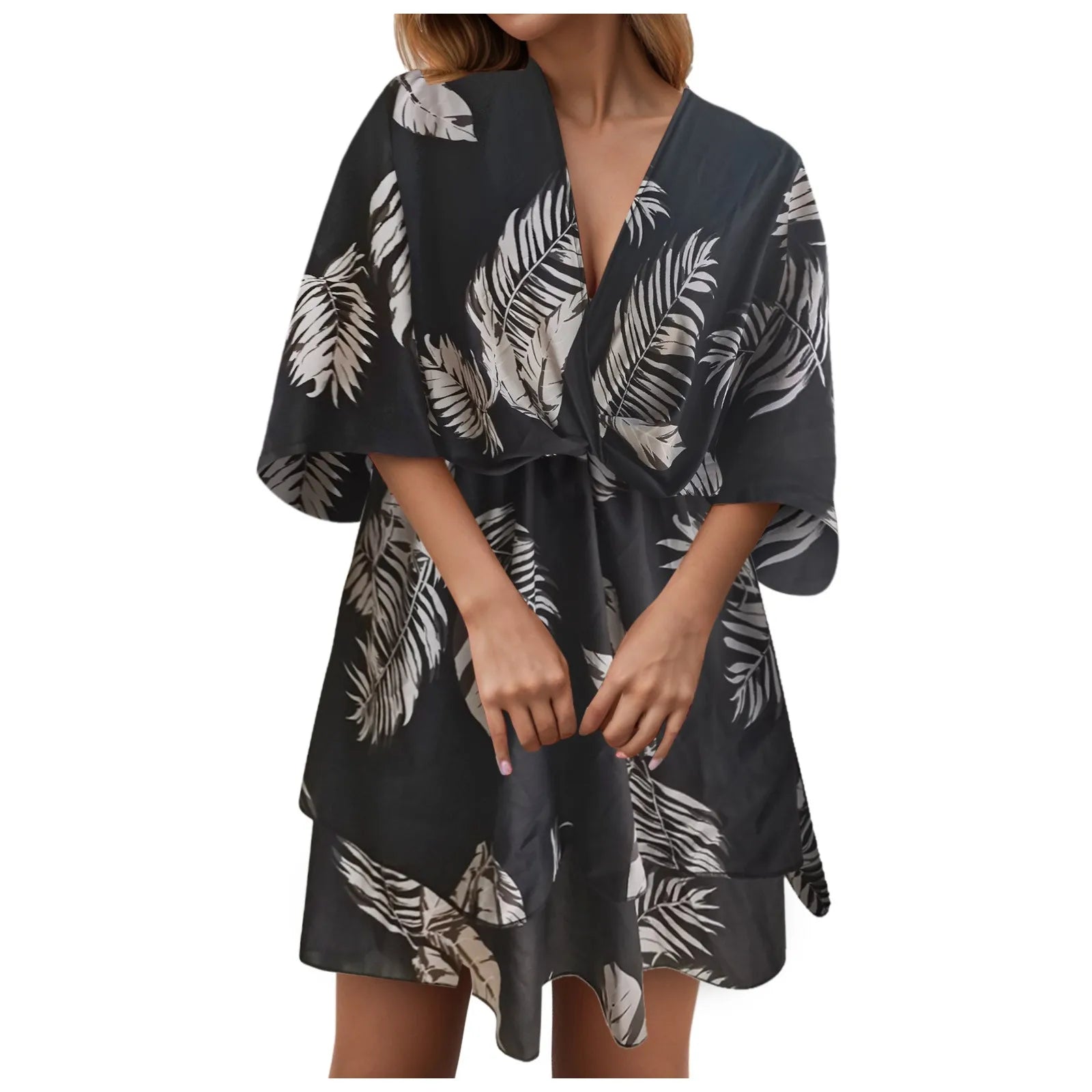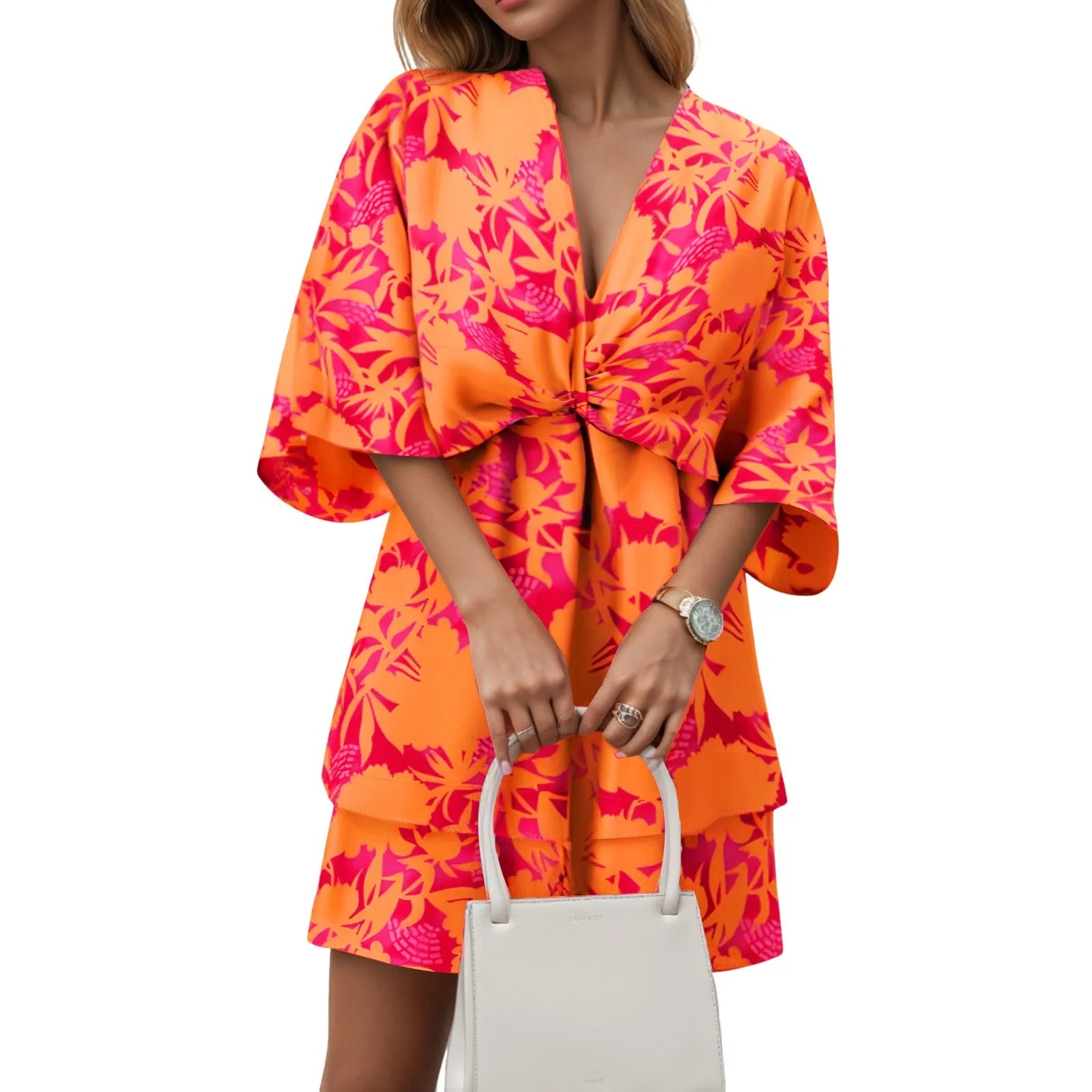 Womens Short A Line Flare Dress Knot Front Short Sleeve Tiered Ruffle Swing Color Printed Mini Dresses