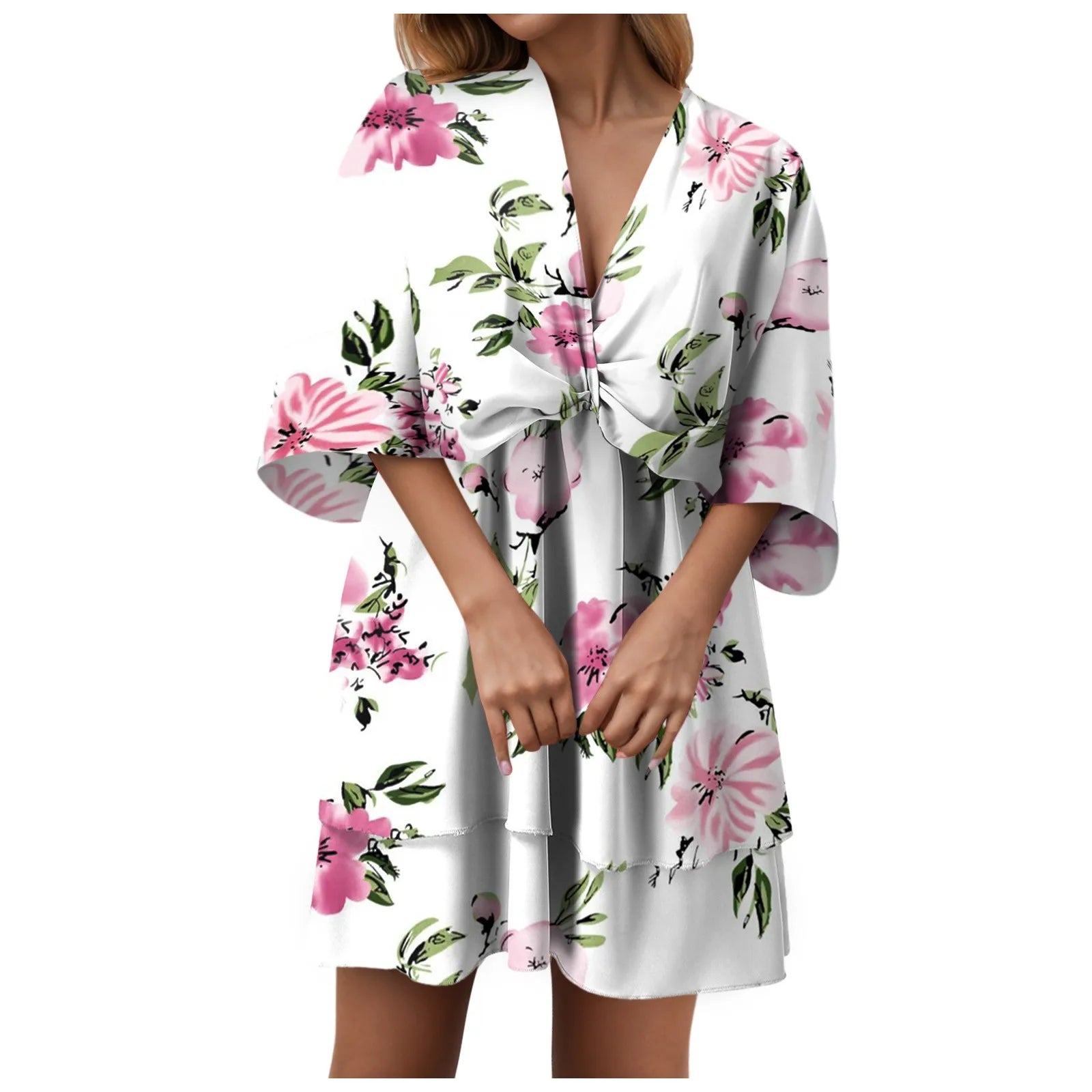 Short Sleeve Maxi Dress Womens Short A Line Flare Dress Knot Front Short Sleeve Tiered Ruffle Swing Dress For Women T Shirt