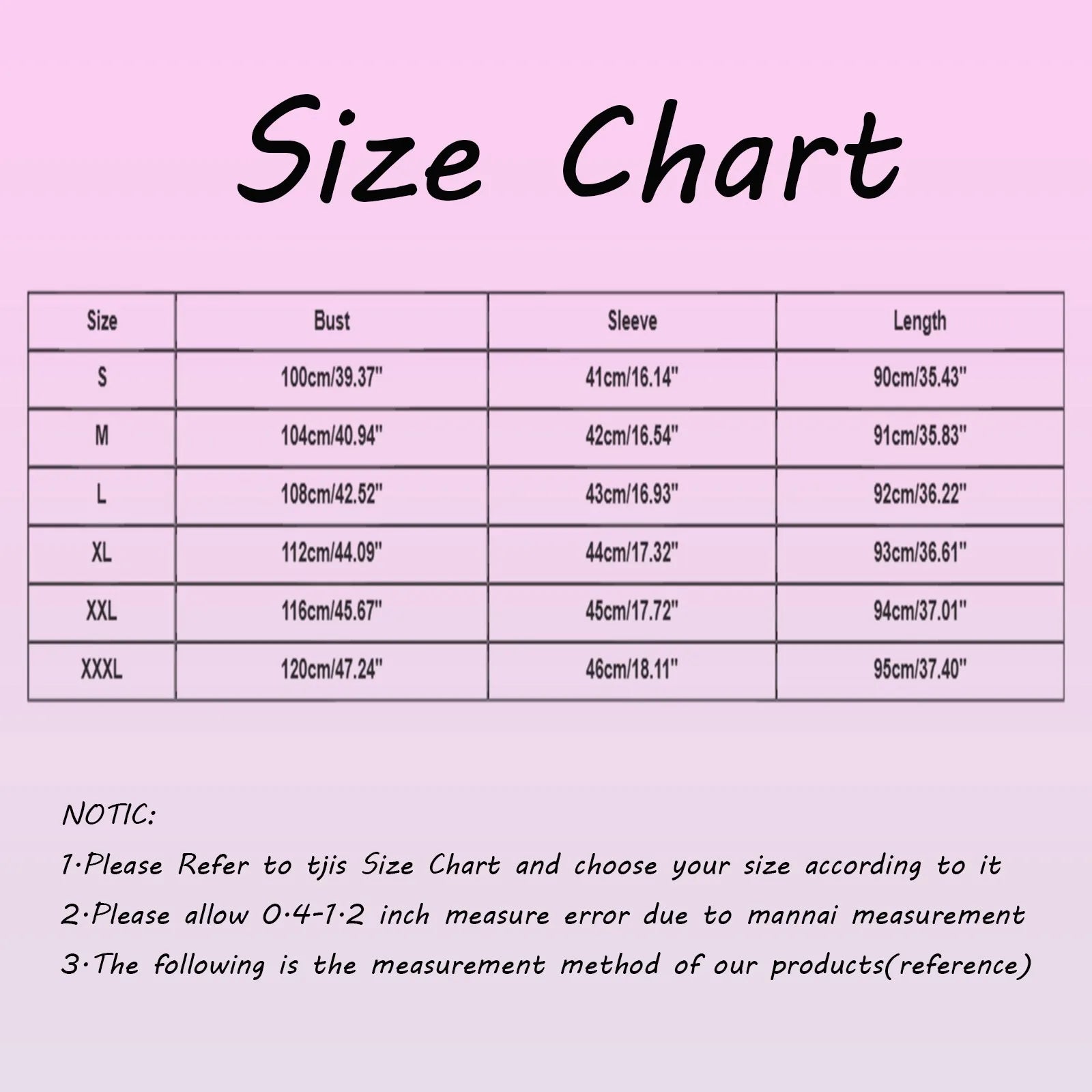 Size Bust Sleeve Length S 100cm/39.37'' 41cm/16.14'' 90cm/35.43'' M 104cm/40.94'' 42cm/16.54'' 91cm/35.83'' L 108cm/42.52'' 43cm/16.93'' 92cm/36.22'' XL 112cm/44.09'' 44cm/17.32'' 93cm/36.61'' XXL 116cm/45.67'' 45cm/17.72'' 94cm/37.01'' XXXL 120cm/47.24'' 46cm/18.11'' 95cm/37.40'' Size:S Bust:100cm/39.37'' Sleeve:41cm/16.14'' Length:90cm/35.43'' Size:M Bust:104cm/40.94'' Sleeve:42cm/16.54'' Length:91cm/35.83'' Size:L Bust:108cm/42.52'' Sleeve:43cm/16.93'' Length:92cm/36.22'' Size:XL Bust:112cm/44.09'' Sleeve:44cm/17.32'' Length:93cm/36.61'' Size:XXL Bust:116cm/45.67'' Sleeve:45cm/17.72'' Length:94cm/37.01'' Size:XXXL Bust:120cm/47.24'' Sleeve:46cm/18.11'' Length:95cm/37.40''