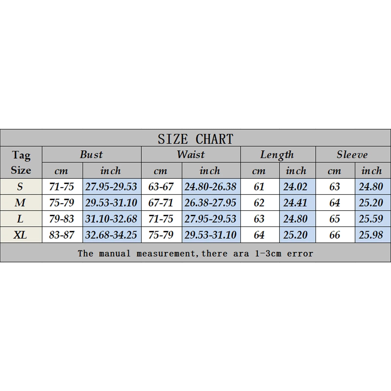 Size Bust Waist Sleeve Length S 71-75cm/27.95-29.53'' 63-67cm/24.80-26.38'' 63cm/24.80'' 61cm/24.02'' M 75-79cm/29.53-31.10'' 67-71cm/26.38-27.95'' 64cm/25.20'' 62cm/24.41'' L 79-83cm/31.10-32.68'' 71-75cm/27.95-29.53'' 65cm/25.59'' 63cm/24.80'' XL 83-87cm/32.68-34.25'' 75-79cm/29.53-31.10'' 66cm/25.98'' 64cm/25.20'' Size:S Bust:71-75cm/27.95-29.53'' Waist:63-67cm/24.80-26.38'' Sleeve:63cm/24.80'' Length:61cm/24.02'' Size:M Bust:75-79cm/29.53-31.10'' Waist:67-71cm/26.38-27.95'' Sleeve:64cm/25.20'' Length:62cm/24.41'' Size:L Bust:79-83cm/31.10-32.68'' Waist:71-75cm/27.95-29.53'' Sleeve:65cm/25.59'' Length:63cm/24.80'' Size:XL Bust:83-87cm/32.68-34.25'' Waist:75-79cm/29.53-31.10'' Sleeve:66cm/25.98'' Length:64cm/25.20''