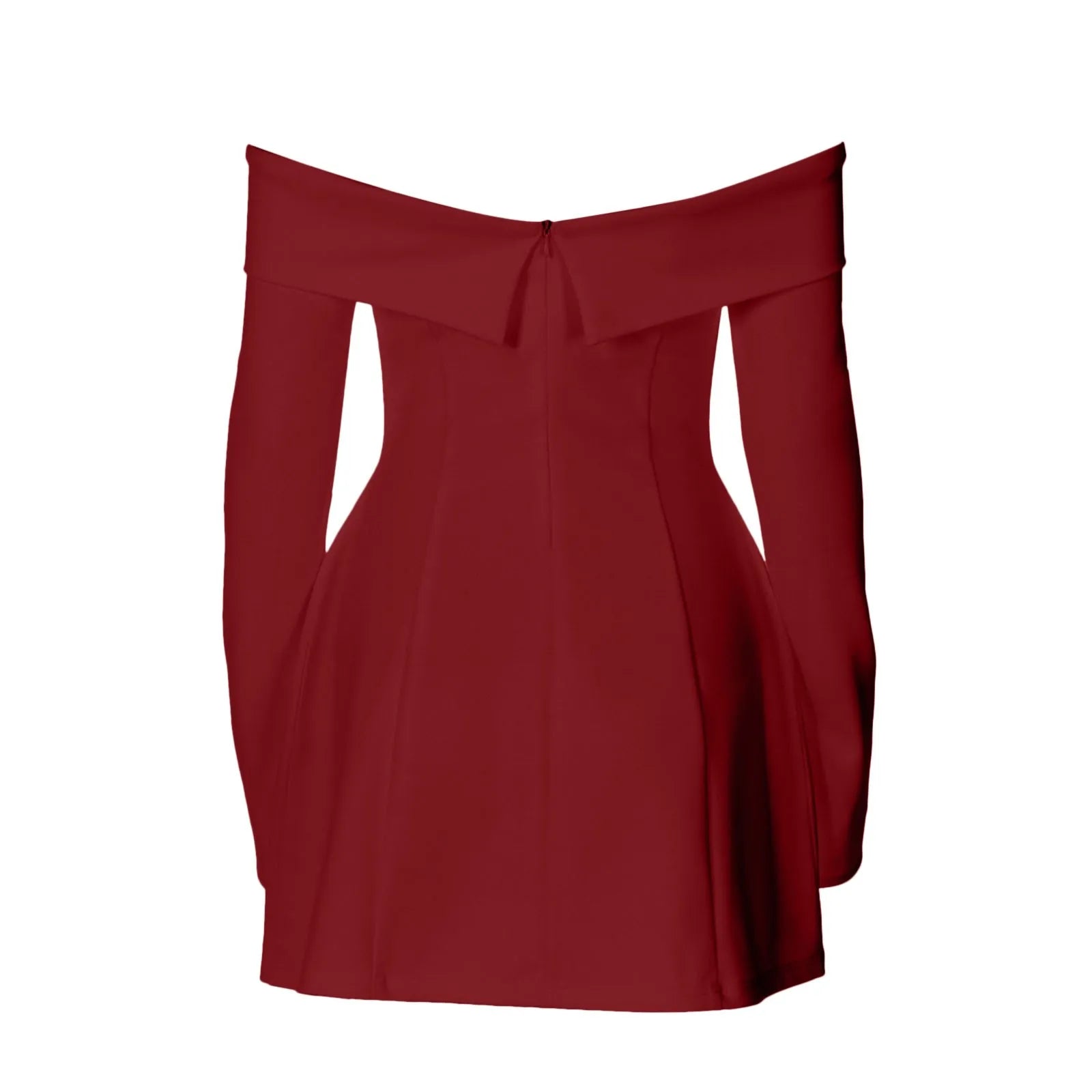 Design: Long sleeve slits, off-shoulder neckline, open back, decorative pockets, fitted top, bubble skirt, flared pants, zipper closure, above knee length, fits the body, simple and chic