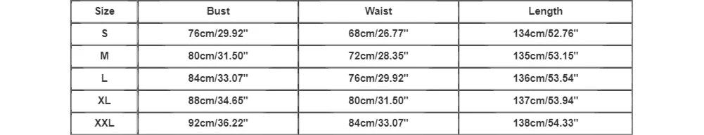 Size Bust Waist Length S 76cm/29.92'' 68cm/26.77'' 134cm/52.76'' M 80cm/31.50'' 72cm/28.35'' 135cm/53.15'' L 84cm/33.07'' 76cm/29.92'' 136cm/53.54'' XL 88cm/34.65'' 80cm/31.50'' 137cm/53.94'' XXL 92cm/36.22'' 84cm/33.07'' 138cm/54.33'' Size:S Bust:76cm/29.92'' Waist:68cm/26.77'' Length:134cm/52.76'' Size:M Bust:80cm/31.50'' Waist:72cm/28.35'' Length:135cm/53.15'' Size:L Bust:84cm/33.07'' Waist:76cm/29.92'' Length:136cm/53.54'' Size:XL Bust:88cm/34.65'' Waist:80cm/31.50'' Length:137cm/53.94'' Size:XXL Bust:92cm/36.22'' Waist:84cm/33.07'' Length:138cm/54.33''