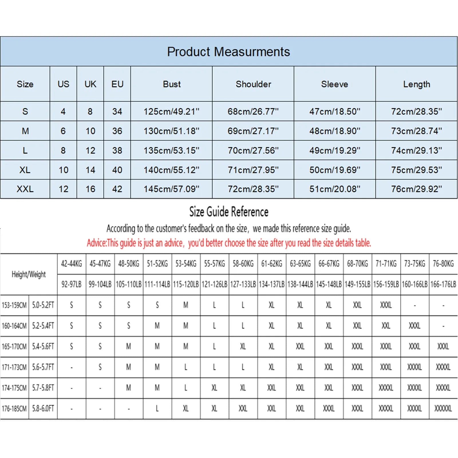 Size US UK EU Bust Shoulder Sleeve Length S 4 8 34 125cm/49.21'' 68cm/26.77'' 47cm/18.50'' 72cm/28.35'' M 6 10 36 130cm/51.18'' 69cm/27.17'' 48cm/18.90'' 73cm/28.74'' L 8 12 38 135cm/53.15'' 70cm/27.56'' 49cm/19.29'' 74cm/29.13'' XL 10 14 40 140cm/55.12'' 71cm/27.95'' 50cm/19.69'' 75cm/29.53'' XXL 12 16 42 145cm/57.09'' 72cm/28.35'' 51cm/20.08'' 76cm/29.92'' Size:S US:4 UK:8 EU:34 Bust:125cm/49.21'' Shoulder:68cm/26.77'' Sleeve:47cm/18.50'' Length:72cm/28.35'' Size:M US:6 UK:10 EU:36 Bust:130cm/51.18'' Shoulder:69cm/27.17'' Sleeve:48cm/18.90'' Length:73cm/28.74'' Size:L US:8 UK:12 EU:38 Bust:135cm/53.15'' Shoulder:70cm/27.56'' Sleeve:49cm/19.29'' Length:74cm/29.13'' Size:XL US:10 UK:14 EU:40 Bust:140cm/55.12'' Shoulder:71cm/27.95'' Sleeve:50cm/19.69'' Length:75cm/29.53'' Size:XXL US:12 UK:16 EU:42 Bust:145cm/57.09'' Shoulder:72cm/28.35'' Sleeve:51cm/20.08'' Length:76cm/29.92''