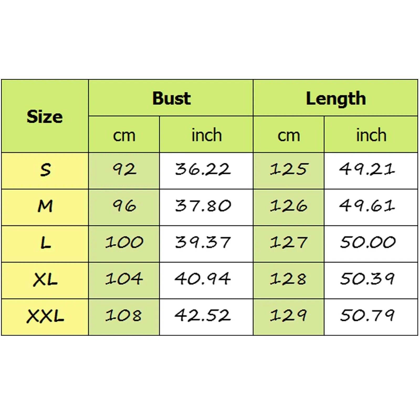Size Bust Length S 92cm/36.22'' 125cm/49.21'' M 96cm/37.80'' 126cm/49.61'' L 100cm/39.37'' 127cm/50.00'' XL 104cm/40.94'' 128cm/50.39'' XXL 108cm/42.52'' 129cm/50.79'' Size:S Bust:92cm/36.22'' Length:125cm/49.21'' Size:M Bust:96cm/37.80'' Length:126cm/49.61'' Size:L Bust:100cm/39.37'' Length:127cm/50.00'' Size:XL Bust:104cm/40.94'' Length:128cm/50.39'' Size:XXL Bust:108cm/42.52'' Length:129cm/50.79''