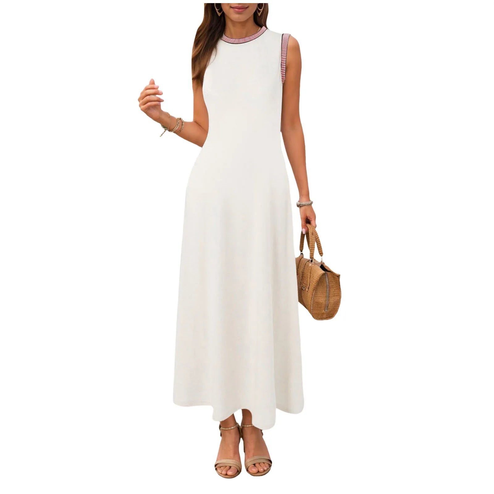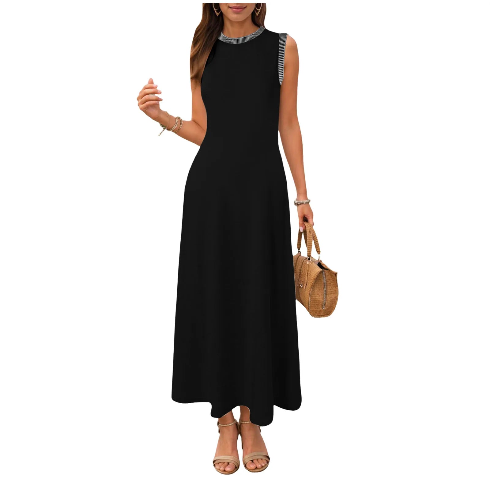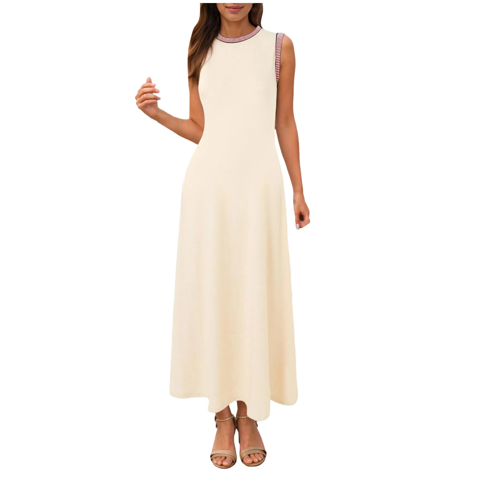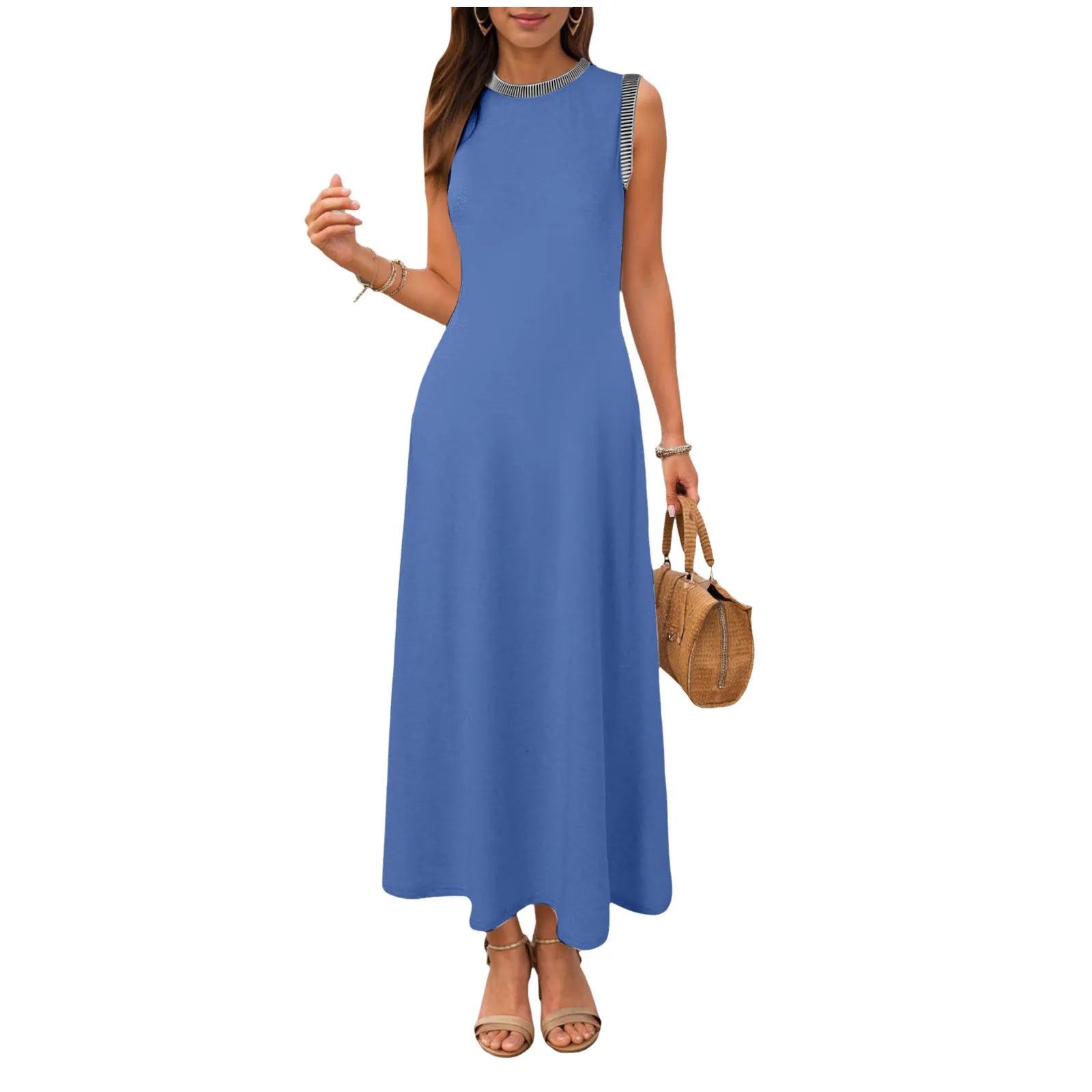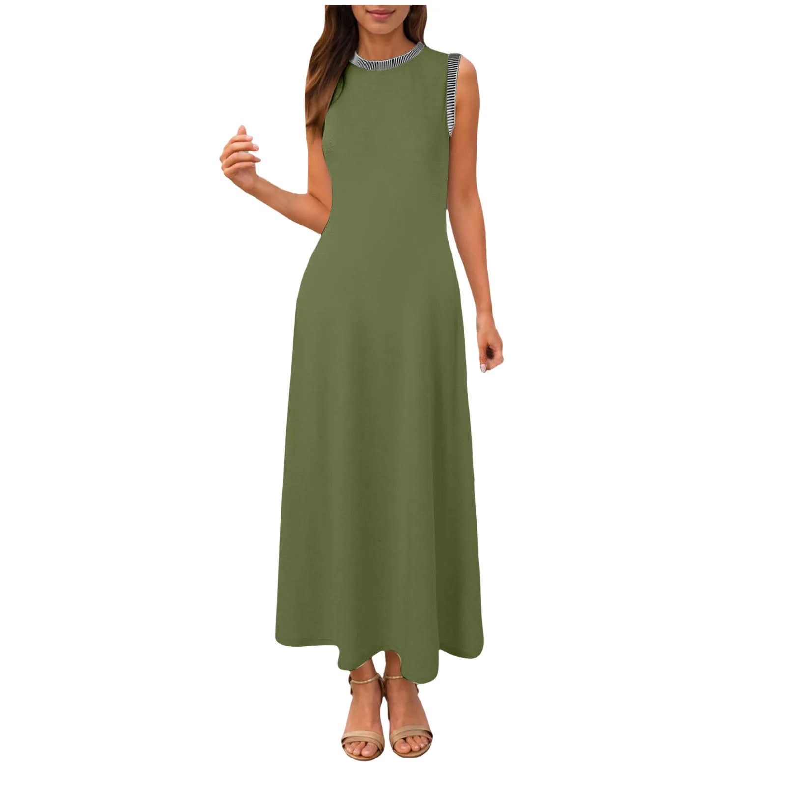 Women Spring Summer Casual Beach Vest Dress Vacation Sleeveless Vest Round Neck Maxi Dress With Pockets