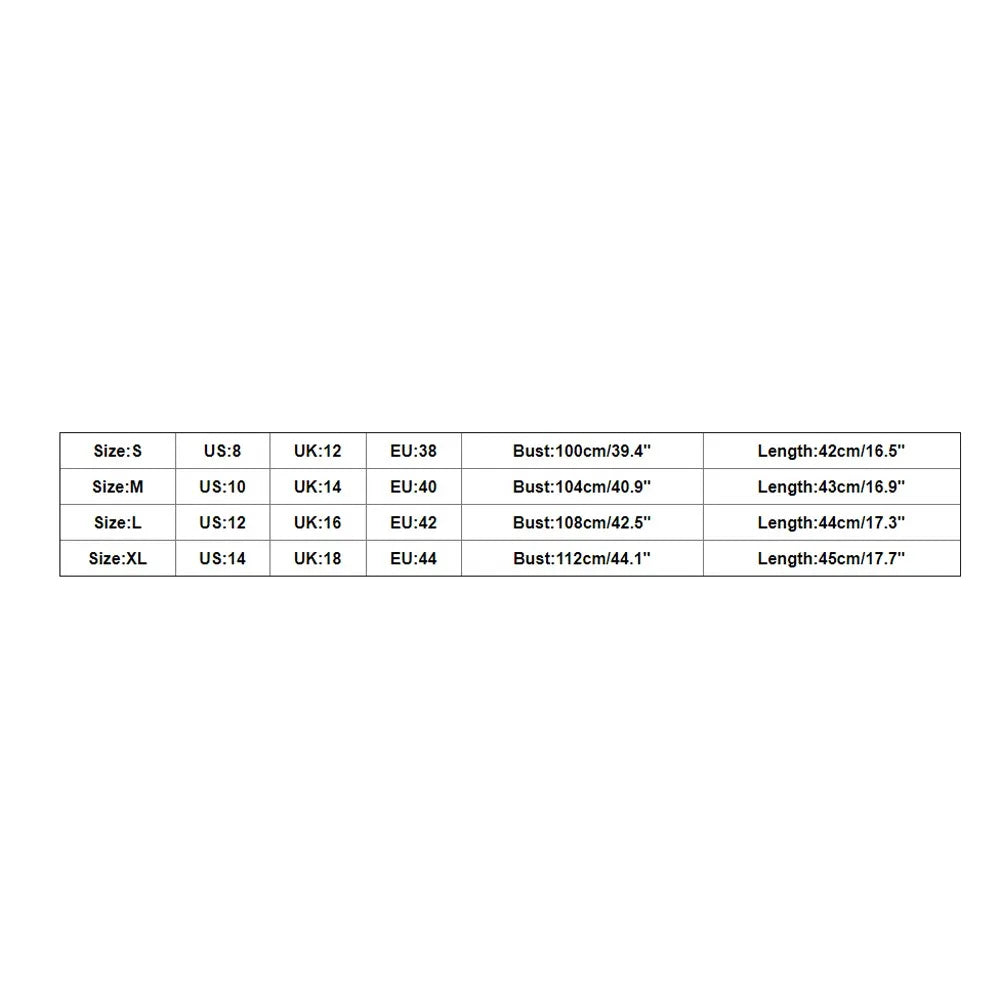 Size US UK EU Bust Length S 8 12 38 100cm/39.4" 42cm/16.5" M 10 14 40 104cm/40.9" 43cm/16.9" L 12 16 42 108cm/42.5" 44cm/17.3" XL 14 18 44 112cm/44.1" 45cm/17.7" Size:S US:8 UK:12 EU:38 Bust:100cm/39.4" Length:42cm/16.5" Size:M US:10 UK:14 EU:40 Bust:104cm/40.9" Length:43cm/16.9" Size:L US:12 UK:16 EU:42 Bust:108cm/42.5" Length:44cm/17.3" Size:XL US:14 UK:18 EU:44 Bust:112cm/44.1" Length:45cm/17.7"